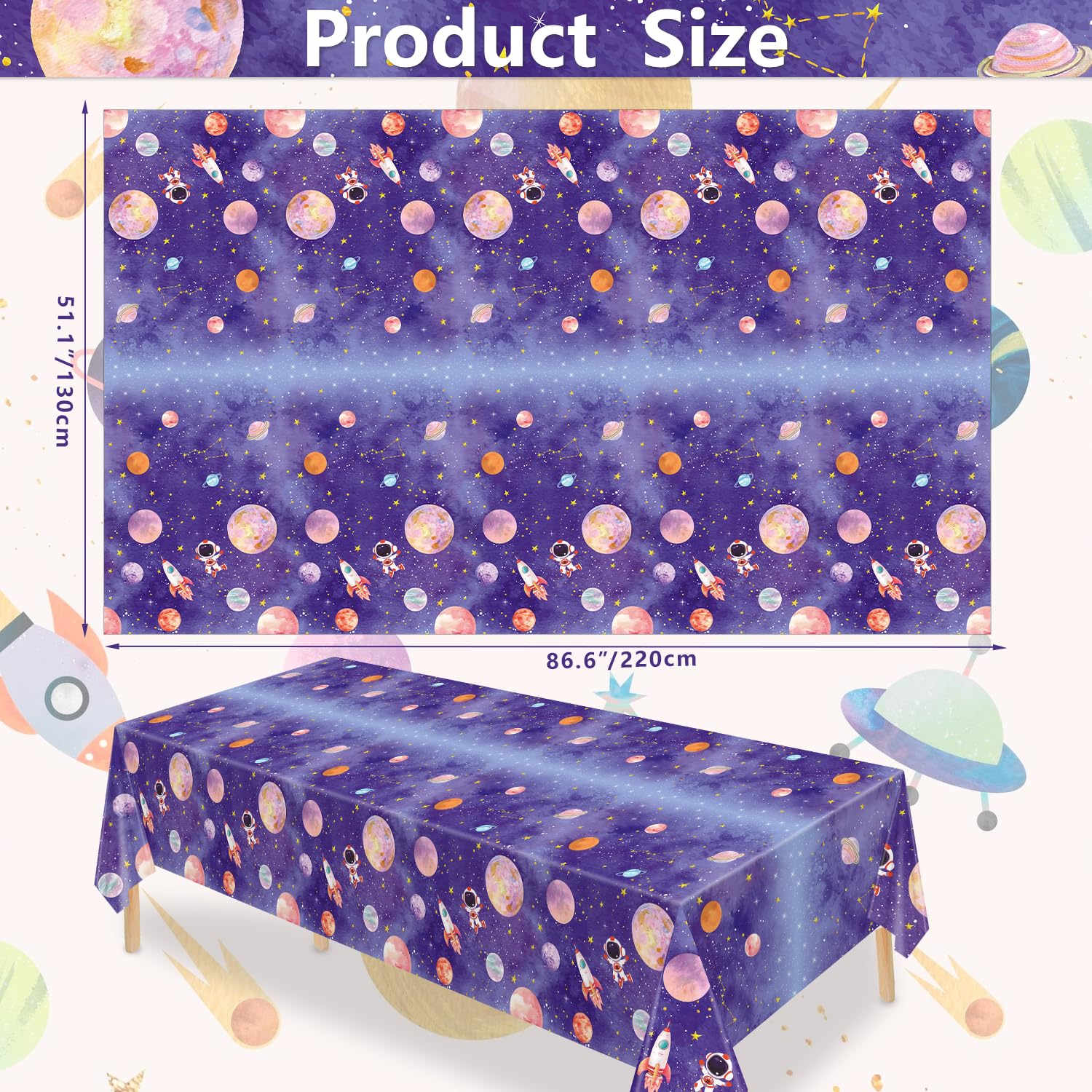 Achetez cet ensemble de nappes spatiales pour protéger votre table des rayures et des taches. Que ce soit seule ou avec des couverts, des serviettes ou d'autres décorations, elle apportera un look mignon et classique à votre table à manger. Nappe Déco Spatiale 220x130 Cm Thématique Galaxie Et Espace : Articles De Fête D'anniversaire Et Décorations – Party Expert Nappe Thème Galaxie Fusée Explorez les mystères de l'espace avec la collection 'Outer Space' de Party Expert. Découvrez des fournitures, décorations et costumes inspirés de l'univers... Elles égayeront votre décoration de fête pour une fête ou un événement à venir et laisseront une impression profonde sur vos invités. Qualité fiable : la nappe spatiale est fabriquée en plastique polyéthylène épais de haute qualité, non toxique, imperméable, résistant à l'huile, aux taches, pas facile à décolorer et à froisser, résistant à la déchirure, léger, pliable et réutilisable, vous pouvez l'utiliser en toute confiance. Design unique : notre nappe galaxie est conçue avec un fond spatial violet qui contient différentes planètes, astronautes, fusées et étoiles. Choix idéal : les nappes de planètes spatiales sont adaptées pour une fête spatiale, une fête galaxie, une fête au soleil, une fête d'anniversaire sur le thème de la salle, une fête d'anniversaire sur le thème de la galaxie, une fête d'anniversaire sur la planète, une fête d'anniversaire sur la planète, une fête de ballon spatial, 1., Fête d'anniversaire de voyage autour du soleil, premier voyage autour du soleil, fête d'anniversaire, réunion, camping, pique-nique, graduations, anniversaire, fête prénatale, arrière-plan photo. Facile à utiliser : l'ensemble de nappes spatiales est super pratique. Elle empêchera la table de fête d'être rayée et sale. Vous pouvez utiliser un chiffon humide ou du papier pour enlever les saletés restantes, telles que les aliments renversés, les boissons, la peinture et bien plus encore. Les enfants et les adultes vont l'adorer. Grande taille pour la décoration]Ces nappes de galaxie de l'espace, mesurant environ 130x270cm, c'est assez long et large pour que vous puissiez décorer... Il suffit d'ouvrir le paquet et de le poser. Les nappes sont réutilisables ou peuvent être jetées pour économiser du temps et de l'énergie. Cette nappe en plastique spatial peut rendre votre fête d'anniversaire spatiale plus colorée. Chemin de Table de Noël 40x140cm Spatial Astronaute Décoration de Table