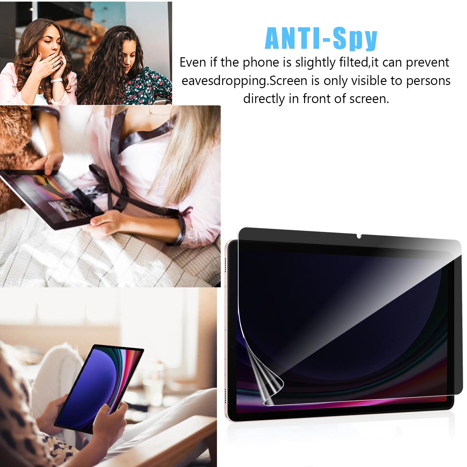 Film Mat Anti-éblouissement Réutilisable CHSTLS 360° Anti-Espion Protection D'écran Magnétique Pour Filtre Confidentialité Magnétique Tablette Protection d'écran magnétique de confidentialité pour Samsung Dscription Protction écran d confidntialité d'origin pour Samsung Galaxy Tab S9. Limit l'angl d vision d l'écran d votr tabltt à 30° n mod paysag. Connxion magnétiqu sur la tranch d votr apparil. Tactil t qualité visull consrvés Livré avec un classeur blanc qui sert de rangement lorsque vous ne vous en servez pas. Protection des yeux: Une technologie avancée bloque 97% de la lumière bleue et des rayons UV, protégeant efficacement vos yeux contre les dommages oculaires, la fatigue visuelle, et les maux de tête. La surface mate et lisse réduit les reflets de 98%, de sorte que vous n'avez plus à vous soucier d'un écran flou en raison de l'éblouissement. 360° Anti-Espion Protection: Notre écran de confidentialité utilise une technologie multicouche avancée, garantissant que votre écran reste clair lorsqu'il est vu de face tout en bloquant complètement les vues latérales au-delà d'un angle de 30°, offrant une protection améliorée par rapport à d'autres. Cette protection d'écran protège également votre écran de la poussière et des rayures lors d'une utilisation quotidienne. Sensibilité Tactile Précise: Le ultra fin de 0,33 mm garantit une réponse rapide et précise comme votre écran nu, très réactif à chaque toucher et pression, pour conserver toute la sensibilité tactile et la sensibilité du crayon de votre tablette. (Note: Cette protection assombrit légèrement l'écran, veuillez augmenter la luminosité de votre écran de lors de son utilisation., ) Coque Clavier Pour Samsung Galaxy Tab S9 Fe 10.9 - Clavier Samsung Tab...