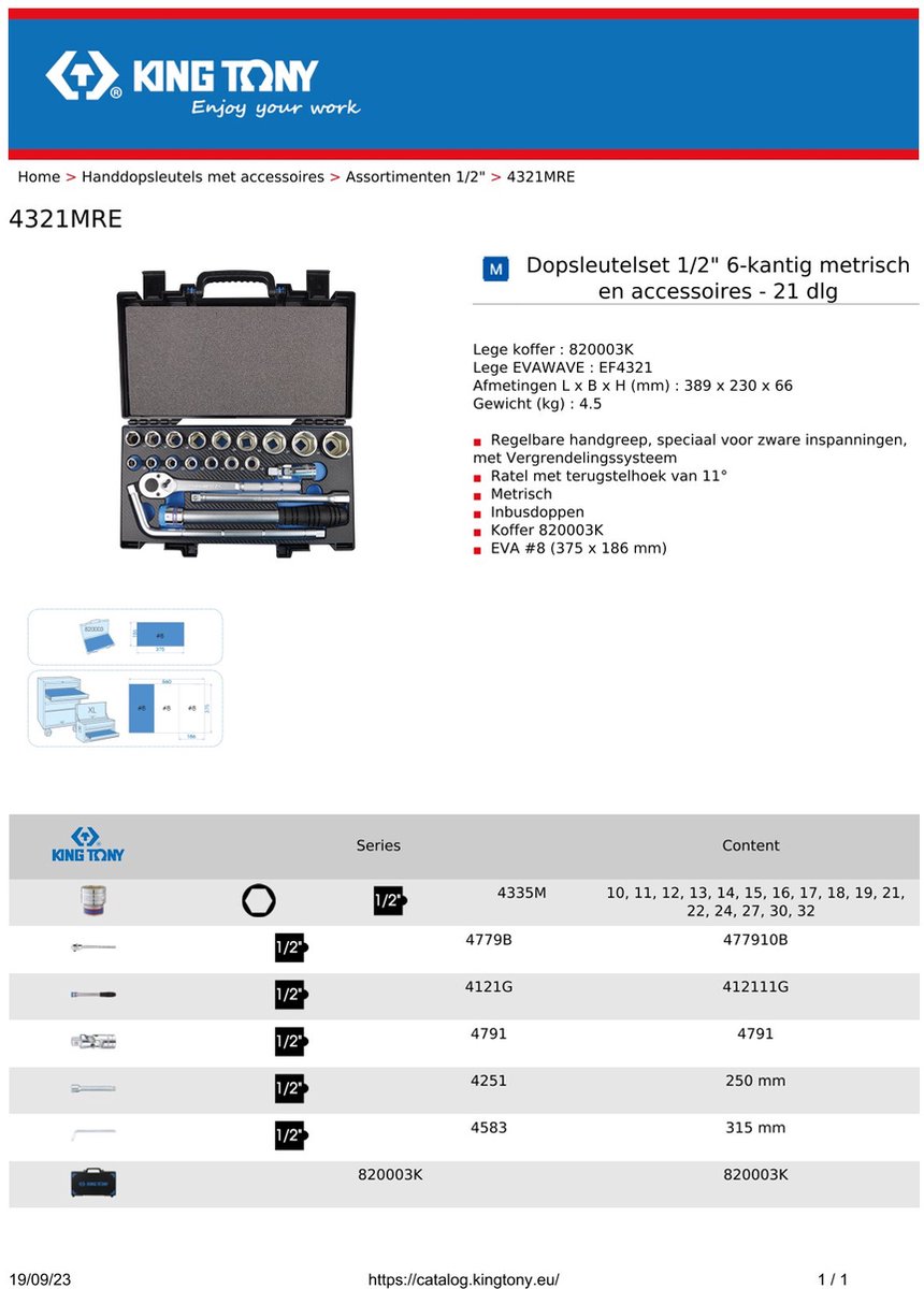 KING TONY - Coffret de douilles longues 1/2 Torx, 9 pièces - Pro... Coffret nouvelle génération 820003K. Partout dans le monde, nous voyons les rayons des grandes surfaces se remplir de produits . Contrairement à bon nombre de confrères Européens qui se sourcent de plus en plus en Asie, King Tony est à la source ! Tony Lin, fondateur de King Tony, surfe sur cette vague. Le coffret qui a fait la renommée de la marque dans le secteur agricole, grâce à son cliquet et sa rallonge, revient avec un design spécial pour les 30 ans. Il peut ainsi offrir des outils professionn Coffret de rangement de douille 1/2 > Outillages a Il répond à la demande de produits de grande consommation à un prix dérisoire. Poignée ajustable brevetée, spéciale effort. Coffret Douilles King Tony Coffret De Douilles Et Accessoires 1/4" - 25 Pièces King Tony Coffret 21 Pièces Chromé Cliquet avec angle de reprise de 11°. 295 mm (type 4121G), cardan 1/2 (12,70mm) universel DIN 3123 L. Édition limitée spéciale 30 ans. KING TONY - Coffret de douilles et accessoires 1/2 - 21pièces Caractéristiques principales de ce produit : Poignée ajustable brevetée, spéciale effort. Cliquet avec angle de reprise de 11°. Métrique. Douilles 6 pans. Coffret en plastique 820003K. EVA #8 (375 x 186 mm La dénomination de l'entreprise ainsi que la marque changent : King Tony est né ! 250 mm (type 4251), et poignée 1/2 (12,70mm) en l à 105° DIN 3120 L., 315 mmn (type 4583). 11 à 32 mm et accessoires - 4321MRE - King Tony C'est la consécration en 1998 avec l'obtention de la certification ISO 9000 et TÜV. 77,5 mm (type 4791), rallonge 1/2 (12,70mm) standard DIN 3123 L. Coffret de vissage : Coffret 21 pcs douilles 1/2 D.
