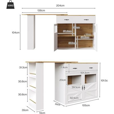 Meuble Multifonction Buffet Table De Bar Extensible De Haute Qualité Avec Rotation à 360° Et Espace De Rangement Table De Bar Enroulable Moderne Avec Tiroirs Pour Cuisine Salon 98214415 Idéal Salon Salle à Manger Planche à repasser extensible - Rotation à 180° - Armoire - Rangement Vepssder Table de Bar Extensible avec Espace de Rangement,Rotation à 360°, Longueur réglable de 120 à 180 cm,Table Cuisine Petit Espace (B-Blanc Naturel) : : Cuisine et MaisonDemandez le retour de ce produit dans les 14 jours suivant la réception, pour quelque raison que ce soit, afin d’obtenir un remboursement complet (prix de l’article et frais de livraison) dans le cadre... 【Table de bar élégante et multifonctionnelle】 : Panneaux MDF/PB de haute qualité avec plateau décoratif et poignées métalliques élégantes. Se transforme facilement en table à manger pour diverses occasions. 【Table de bar buffet polyvalente 】: Utilisation polyvalente comme buffet de rangement, table de bar, table à manger ou table de travail. Longueur extensible : 120-180 cm Largeur : 40 cm Hauteur : 76 cm Poids du produit : 48 kg Charge maximale : 60 kg Matériau du plateau : MDF Matériau du cadre : MDF Rotation : Confirmer Nombre de colis : 2 Contenu de la livraison : 1 table de bar avec notice de montage et matériel de montage Entretien : Essuyer avec un chiffon humide, puis sécher avec un chiffon propre. Idéale pour les besoins de la vie moderne. 【Table à manger pratique et esthétique】 : Allie un savoir-faire exceptionnel à une fonctionnalité pratique. Cette table de bar est à la fois une solution de repas pratique et un élément décoratif. Table de salle à manger extensible 110-140x80cm avec portes en rotin, table pliante pour 4-6 personnes, design compact pour cuisine et salon, fonctionnalité extensible et rangement intégré