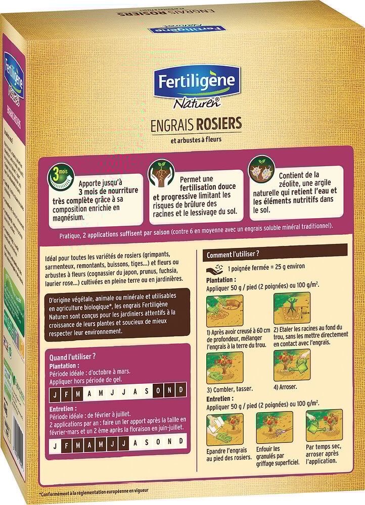 9,0 % Soufre soluble dans l’eau (S) La teneur élevée en matière organique stimule l’activité biologique du sol, ce qui permet une libération et une absorption plus efficaces des nutriments par les racines des rosiers et des plantes fleuries. Instructions d’utilisation Répartir l’engrais uniformément autour des plantes et l’incorporer légèrement à la couche supérieure du sol pour favoriser une bonne répartition des nutriments et améliorer leur absorption par les racines. 0,2 % Sodium soluble dans l’eau (Na), 52,6 % Matière organique 1,4 % Azote uréique (N) Cet engrais contient 52,6 % de matière organique et est riche en minéraux et oligo-éléments, favorisant une vie microbienne active et une meilleure structure du sol. Grâce à sa formule enrichie en fer (Fe) et en magnésium (Mg), il est idéal pour favoriser la croissance optimale des plantes. Formats disponible: 400g; 2kg; 10... Plantes établies : appliquer 50 g/m² au début du printemps, après la taille et lors de la reprise de croissance. Résultat : des plantes plus fortes, un enracinement robuste, une floraison prolongée et des couleurs de fleurs plus éclatantes. Les minéraux argileux présents dans la composition améliorent la rétention d’eau et de nutriments du sol. Le magnésium améliore également l’absorption des autres nutriments et renforce l’intensité des couleurs des fleurs, pour des plantes visiblement plus saines et plus éclatantes. Le phosphate et le potassium sont entièrement absorbés par les plantes. ✅ SÛR ET FACILE À UTILISER : Formule douce pour les racines sensibles, avec des granulés fins pour une distribution uniforme et une croissance stable. Associé aux minéraux et oligo-éléments, le sol est naturellement enrichi, ce qui prévient les carences nutritionnelles chez les plantes. ✅ RACINES FORTES : Stimule un système racinaire sain pour des rosiers et des plantes ornementales à fleurs plus résistants. Quel engrais pour rosiers et quand le mettre pour plus de fleurs... Grâce à leur forme constante et leur poids idéal, les granulés se répartissent de façon large et précise – aussi bien dans les jardins d’ornement que pour un usage professionnel sur plates-bandes et parcelles de culture. Répéter l’application au printemps, puis environ trois semaines après le début de la floraison, selon la variété – généralement en été. Une carence peut rapidement entraîner une décoloration des feuilles, une baisse de leur qualité et un affaiblissement de la floraison. Engrais Vivaces Pots Engrais Pour Rosiers Et Fleurs Tout-en-un - 20 Kg Pour 400 M² - Organifer Engrais Organo-minéral Magnésium La fraction restante devient progressivement disponible les années suivantes grâce à la conversion microbienne. Un sol riche en humus retient mieux l’eau, améliore l’aération et crée une base stable pour une croissance saine. Arroser généreusement après la mise en place. Au cours de la première saison de croissance, la majeure partie de l’azote est libérée. Ces éléments sont indispensables pour des tiges robustes, des boutons floraux bien formés et des fleurs éclatantes tout au long de la saison. ✅ MATIÈRE ORGANIQUE : 52,6 % de matière organique enrichit le sol, améliore sa structure et augmente naturellement sa fertilité. Les arbustes à floraison abondante peuvent nécessiter une dose légèrement plus élevée, tandis que les vivaces peuvent nécessiter un peu moins. Seul un apport adapté en nutriments essentiels - comme l’azote pour la croissance du feuillage, le phosphate pour le développement des racines et la formation des fleurs, et le potassium pour des parois cellulaires solides et une meilleure résistance - permet aux plantes ornementales de s’épanouir pleinement. 2,0 % Oxyde de magnésium total (MgO) 2,4 % Phosphate soluble au citrate d’ammonium neutre (P₂O₅) À partir de l’automne, les rosiers ne doivent plus être fertilisés. Engrais pour Gazon Tout-en-Un (20x = 400 kg – pour 8.000 m2