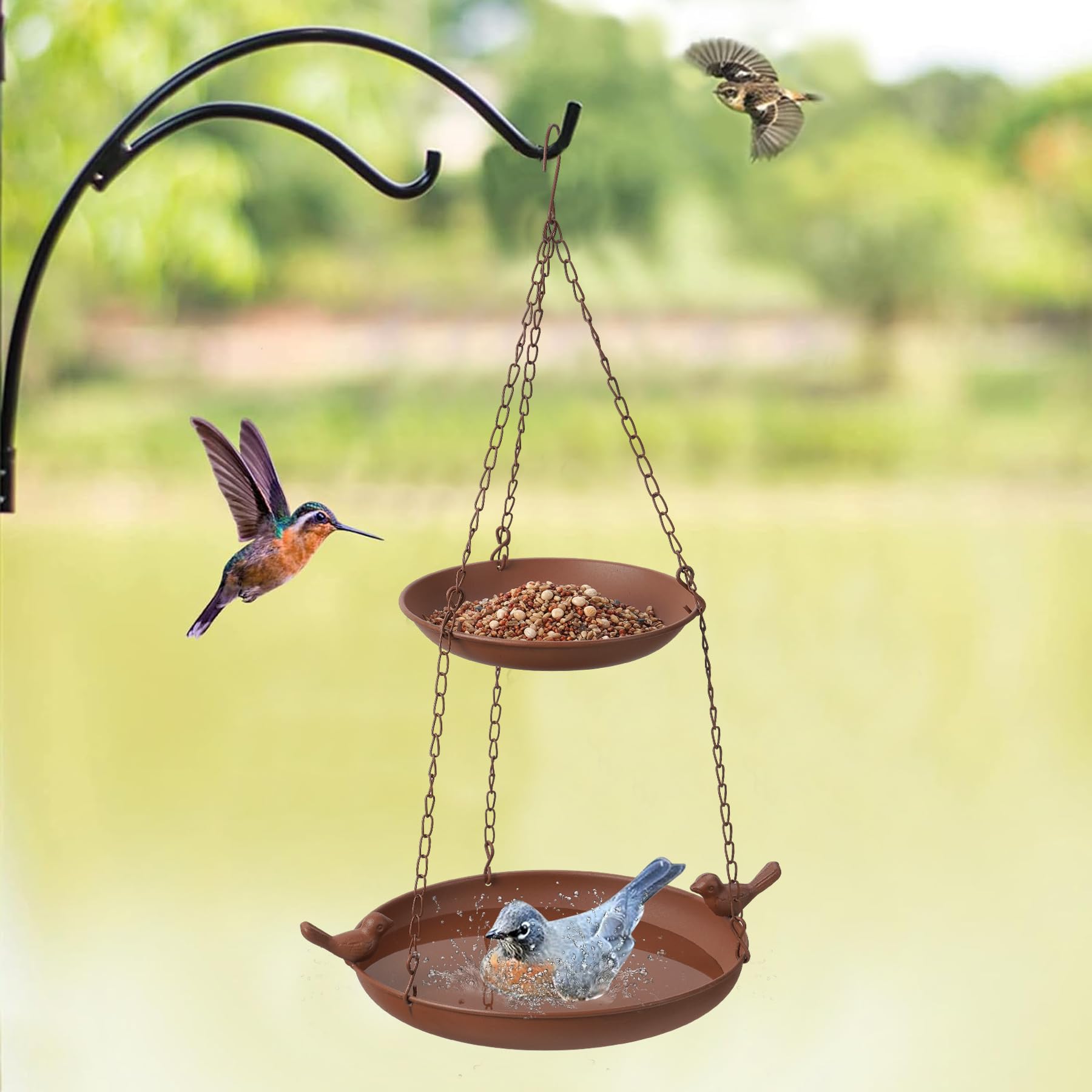 Décorations d'oiseaux délicates Ce bain d'oiseaux est particulièrement adapté pour les amoureux de la nature et les amateurs d'oiseaux. Facile à utiliser, plaisir sans fin L'utilisation de la mangeoire pour oiseaux JUJOYBD est très simple. La mangeoire à oiseaux à plateforme convient à une grande variété d'oiseaux, tels que les pinsons, les cèdres, les colombes, les pics, les geais bleus, les troglodytes, les fauvettes, les moineaux, etc. Matériau durable : Fabriqué en polypropylène et recouvert d'une résine, notre abreuvoir suspendu résiste à la pluie, aux... Cette beauté rustique transforme votre espace extérieur en un endroit charmant qui attire non seulement les oiseaux, mais aussi ravit l'œil du spectateur. Design 2 en 1 : le bain d'oiseaux suspendu JUJOYBD combine deux fonctions : bain d'oiseaux et mangeoire. Lot de 2 gamelles pour oiseaux à suspendre - Distributeur de nourriture... Grâce au crochet en forme de S intégré, vous pouvez installer rapidement et sans outils la mangeoire à n'importe quel endroit, que ce soit sur un arbre, une clôture ou un support spécial. Il suffit de remplir les bols avec de l'eau ou de la nourriture pour oiseaux, et vous avez l'endroit idéal pour vous détendre et manger. Bain Mangeoire 2 En 1 JUJOYBD Bain D'oiseaux Et Mangeoire 2 En 1 En Métal à Suspendre Bain Oiseaux Double Niveau Jardin Que ce soit par un matin ensoleillé ou lors d'une soirée chaude, le bac de douche pour oiseaux de JUJOYBD attire les oiseaux voisins qui y volent joyeusement. Que ce soit pour les amateurs de jardin ou l'organisateur de réunions de famille, ce produit peut faire partie de vos activités de plein air. Le design bien pensé favorise non seulement le bien-être des oiseaux, mais fait également de votre jardin un attrait populaire pour les espèces d'oiseaux domestiques, ce qui rend votre espace extérieur plus vif et intéressant. La taille généreuse offre à différentes espèces d'oiseaux suffisamment d'espace pour se baigner et manger en toute sécurité. Aspect rustique attrayant : avec son aspect rouille unique, le distributeur de nourriture pour oiseaux s'intègre harmonieusement dans n'importe quel paysage de jardin. Solution parfaite pour l'entretien des oiseaux : ce bain d'oiseaux a été spécialement conçu pour répondre aux besoins des oiseaux et offre une protection contre les chats. De cette façon, vous créez un environnement vivant qui attire différentes espèces d'oiseaux pour profiter du temps. Cela offre non seulement aux oiseaux un environnement sûr et confortable, mais rend également votre espace extérieur plus vivant. Il est idéal pour les familles, les écoles, les parcs et les jardins communautaires et aide tout le monde à mieux vivre la nature et à profiter de la joie de la compagnie des oiseaux. Description du produit Mangeoire à oiseaux à suspendre en métal à deux niveaux – Apportez de la vie à votre espace extérieur Au milieu de l'agitation de la vie quotidienne, tout le monde aspire à profiter de la tranquillité et de la beauté de la nature. La combinaison parfaite d'un bain d'oiseaux à deux couches et d'un lieu d'alimentation permet aux oiseaux de se baigner, de boire et de manger tout en étant un élément attrayant dans votre espace extérieur. Trouvez un endroit approprié, suspendez-le et remplissez-le d'eau ou de nourriture pour oiseaux pour offrir aux oiseaux un habitat idéal. Zeuwets Abreuvoir Oiseaux, 2 Pcs Mangeoire Oiseaux Exterieur, Bain d La couche supérieure peut être remplie d'eau, tandis que la couche inférieure est utilisée pour la nourriture des oiseaux.