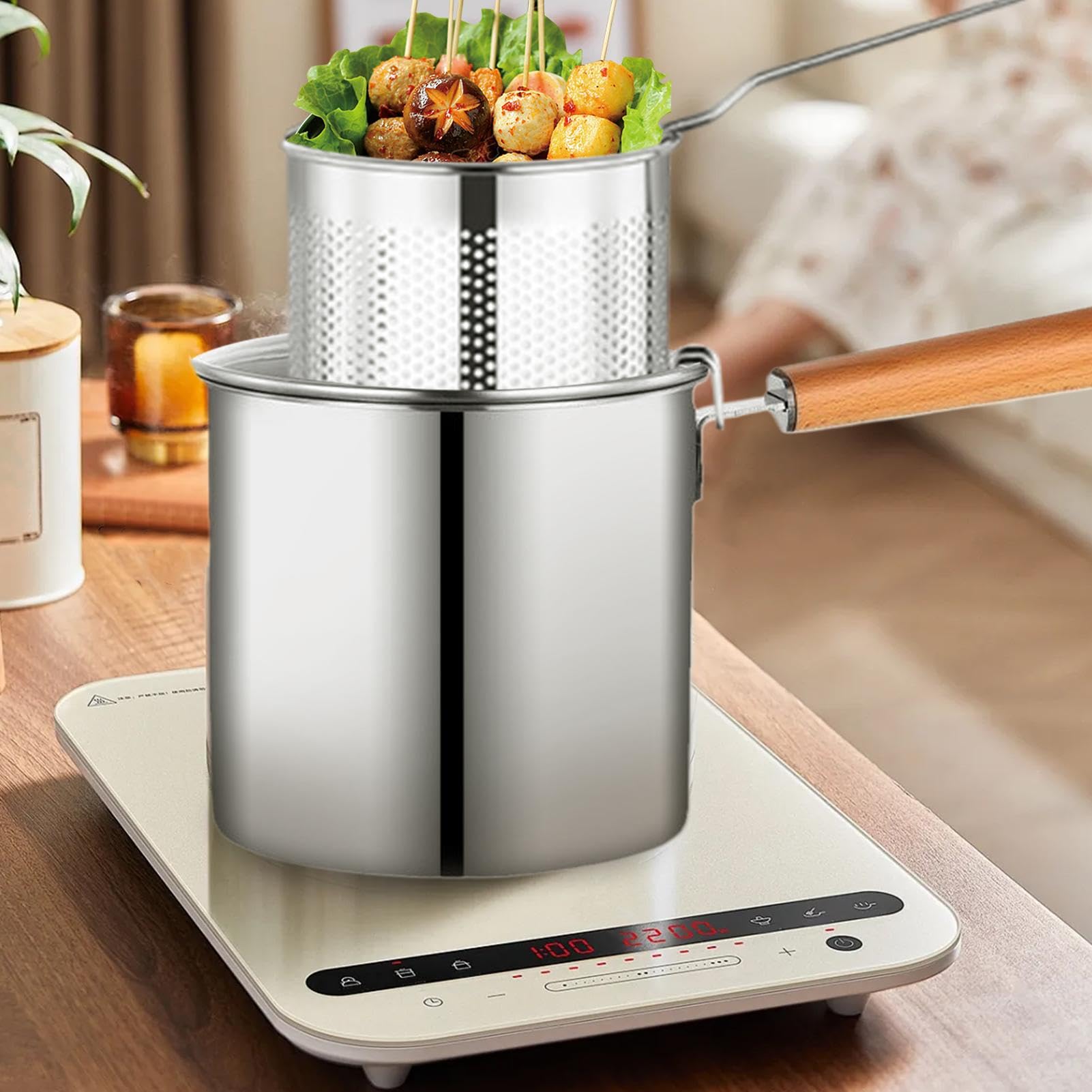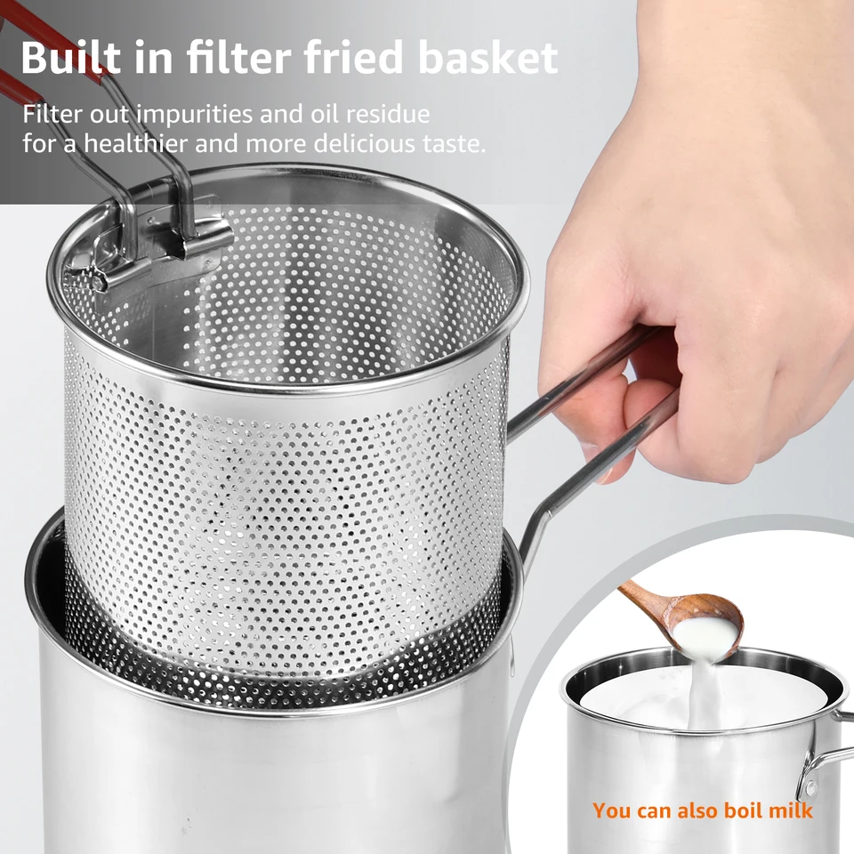 [👨🍳 Parfait pour Votre Cuisine]: Vous voulez surprendre vos proches avec un délicieux poulet ou des fruits de mer frits à la perfection ? Vous voulez vous assurer que vos crevettes ou rondelles d'oignon sont toujours croustillantes et à leur point ? Cette poêle avec passoire est la solution parfaite. Il simplifie le stockage de diverses formes de graisse et d'huiles telles que la graisse de bacon, les graisses, le saindoux, l'huile de noix de coco... Elle convient à tous les types de cuisinières, y compris le gaz et l'induction. Matériau : acier inoxydable 304., Capacité : 2500 ml. Friteuse Inox 2.5 Litres Friteuse à Frites Et Panier En Acier Inoxydable, 2,5 L Pot De Filtre à Panier Friture Avec Passoire Couvercle La passoire en acier inoxydable élimine les particules fines de l'huile, des sauces ou des soupes, ce qui permet de réutiliser l'huile. Le panier de friture inclus est facile à utiliser. [🔍 Filtration et Stockage Efficaces de l'Huile]: Comprend une casserole en acier inoxydable de 2,5 L (20 × 10,5 cm) avec poignée de 18 cm, une passoire à mailles fines, un couvercle et un clip. [🔧 Polyvalent]: Cette petite friteuse est sûre, efficace et rapide pour une variété de processus de cuisson, à la fois simples et complexes. Parfait pour la maison, la cuisine, le restaurant, le camping, les excursions, les pique-niques et les fêtes. Il peut également être utilisé pour faire bouillir de l'eau pour le thé ou le café, chauffer du lait et préparer des pâtes, des légumes ou de la soupe. Contenu : 1 friteuse + 1 couvercle + 1 panier passoire + 1 clip Friteuse, Friteuse Électrique 2500W Avec Panier, Acier Inoxydable... Il est si polyvalent qu'il permet de tout préparer, des ailes et cuisses de poulet aux fruits de mer, crevettes, rondelles d'oignon, frites et bien plus encore ! Comprend un panier en acier inoxydable résistant à la corrosion, parfait pour la friture ou l'échaudage. Friteuse Électrique, Double Cylindre Double Panier En Acier Inoxydable Friteuse À Poser
