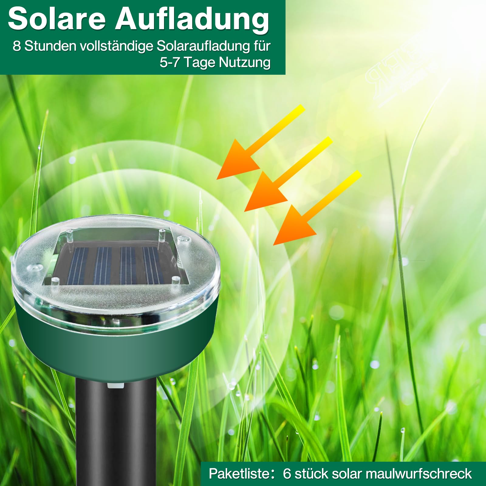 L'effet est meilleur si vous l'utilisez dans un environnement fermé., 3., Lors de l'utilisation, évitez une obstruction directe par des objets afin de ne pas affecter l'effet répulsif contre les rats., 4., Étant donné que les couvertures, les vêtements ou autres objets mous absorbent les ondes ultrasonores, ne les placez pas devant le produit modifié. Répulsif Taupes Solaire Ultrasons Lot De 4 Répulsifs Solaires Anti-taupes - Répulsif à Ultrasons - IP66 étanche Et Résistant à La Poussière - Répulsif Contre Les Taupes - Pour La Pelouse Et Le Jardin - Orange Detaupeur Petards Kit Complet Parce qu'il est compact et facile à transporter. Il suffit de le placer dans un endroit ensoleillé pour profiter d'une protection continue contre les taupes sans vous soucier de la consommation d'énergie, il est respectueux de l'environnement et économe en énergie Installation facile : il suffit de le planter dans le sol pour terminer l'installation. Convivial pour les humains et les animaux domestiques : le répulsif solaire à ultrasons émet de fortes ondes de vibration et des bips. Anti taupes solaire – Trouvez le meilleur prix - Respectueux des humains et des animaux domestiques : le répulsif solaire à ultrasons émet de fortes ondes de vibration et des bips. Large couverture : les répulsifs solaires anti-taupes à ultrasons peuvent couvrir une zone de 200 mètres carrés en émettant des impulsions basse fréquence toutes les 20 secondes pendant 3 à 4 secondes qui pénètrent dans le sol et empêchent les taupes de pénétrer dans la zone protégée. Les répulsifs solaires anti-taupes sont sans danger pour l'homme et les animaux, mais il est recommandé de les placer à l'extérieur., Conseils : 1., Veuillez le placer dans un endroit plus élevé sur le sol lors de l'utilisation., 2., Veuillez ne pas regarder les portes ou les fenêtres lors de l'utilisation. (Remarque : en cas de forte pluie ou de typhon, veuillez aller temporairement à l'intérieur., ) Les répulsifs solaires anti-taupes sont sans danger pour l'homme et les animaux, mais il est recommandé de les placer à l'extérieur. Le répulsif solaire contre les taupes vibre et génère des ondes sonores de 400 à 1000 Hz lorsqu'il fonctionne, stimulant ainsi le système nerveux central des souris destructrices, des cafards, des serpents et d'autres rongeurs, et finit par atteindre l'effet de répulsion EWENYS Lot de 4 Anti Taupe Solaire Vibration et Ultrasons, Contre Les Taupes Serpents Nuisibles... - Fonctionne à l'énergie solaire : le répulsif à ultrasons anti-taupes est équipé d'un panneau solaire qui peut être alimenté en absorbant la lumière du soleil, de sorte qu'il n'est pas nécessaire de changer la batterie. Comme il s'agit d'un capteur à ultrasons, un léger bruit est entendu. Pour un effet optimal, nous vous recommandons d'appliquer un répulsif anti-taupes sur votre pelouse tous les 5 à 8 mètres La portée du travail : 400 mètres carrés Contenu de l'emballage : 4 répulsifs solaires à ultrasons pour taupes.