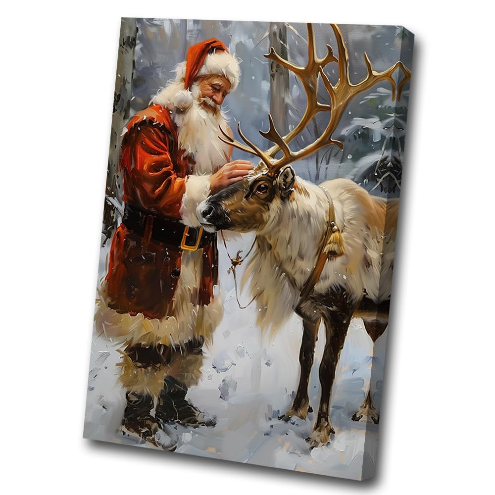 Coloriage De Dessin Au Trait Père Noël Avec Renne Heureux De Distribuer... Des tons vintage doux et de douces chutes de neige créent une atmosphère chaleureuse de livre de contes, parfaite pour ajouter du charme de Noël à votre salon, entrée ou manteau de cheminée Toile Mural Noel Toile Vintage Père Noël Et Renne | Décoration Murale De Noël Cadre Noel Toile murale vintage de Noël - Père Noël, renne, traîneau