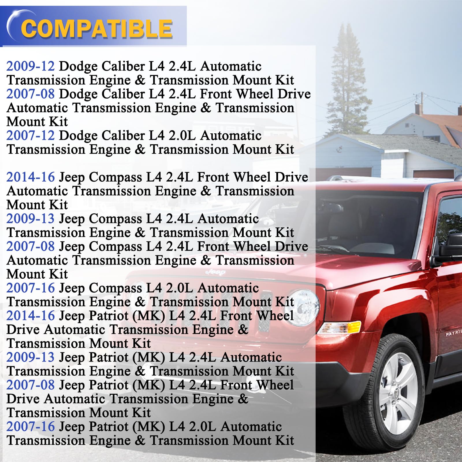 Pièces Rechange Dodge Caliber 2.0L Shkalacar Support Moteur Et Support De Transmission De Kit Supports Moteur Jeep Compass Patriot Shkalacar Replacement Engine Mount and Transmission Mount Compatible Large application : remplacement pour Dodge Caliber 2.0L 2007-2012, Jeep Compass 2.0L 2007-2017, Jeep Patriot 2.0L 2007-2017. Ce kit de support de moteur est un... Pour garantir les meilleures performances et longévité de ce kit de support moteur, une installation professionnelle est fortement recommandée. Matériau principal : aluminium. Placement sur le véhicule : avant, arrière, droite La couleur noireÉquipement: Remplacement Compatible avec Dodge Caliber 2., 0L 2007-2012., Remplacement Compatible avec Jeep Patriot 2., 0L 2007-2017., Remplacement Compatible avec Jeep Compass 2., 0L 2007-2017., Informations sur le colis : Taille du paquet: 30*25*15 cm/11., 81*9., 84*5., 91 pouces Poids du colis: 3700g/8,16lbListe des paquets : 1 * support moteur avant 1 * support moteur avant droit 1 * support moteur moteur arrière 1 * support de transmission Caractéristiques: Stabilité améliorée du véhicule : la fonction de cet ensemble de support moteur est de maintenir le moteur et la boîte de vitesses fixes et stables, assurant le bon fonctionnement de votre véhicule et améliorant le confort de votre conduite. 🚓Stabilité améliorée du véhicule : la fonction de cet ensemble de support moteur est de maintenir le moteur et la boîte de vitesses fixes et stables, assurant le bon fonctionnement de votre véhicule et améliorant le confort de votre conduite. 🚓Large application : remplacement Compatible avec Dodge Caliber 2., 0L 2007-2012, Compatible avec Jeep Compass 2., 0L 2007-2017, Compatible avec Jeep Patriot 2., 0L 2007-2017., Ce kit de support moteur est un choix polyvalent pour de nombreux propriétaires de voitures. 🚓Contenu complet : le colis comprend 4 supports de moteur différents : support moteur avant droit A5415, support moteur avant A5416, support moteur arrière A5417 et support de transmission A5418., Ce kit complet vous fournit tout ce dont vous avez besoin pour une installation complète. Contenu complet : le colis comprend 4 supports de moteur différents : support moteur avant droit A5415, support moteur avant A5416, support moteur arrière A5417 et support de transmission A5418