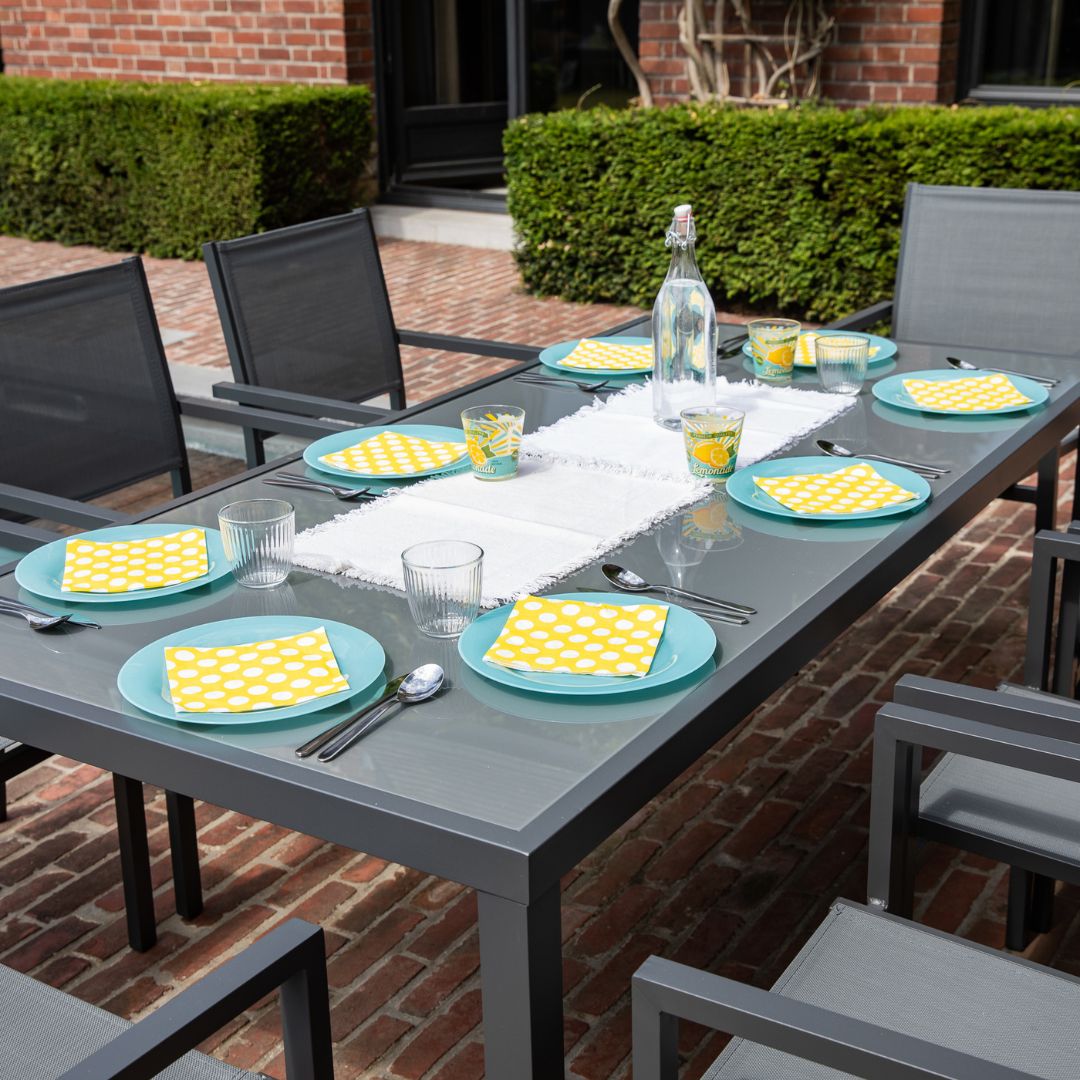 eminza Salon de jardin aluminium 8 places 6 pcs Monte Carlo Blanc et beige Black Le salon de jardin BARI est un très bel ensemble composé d'une table et de 8 chaises. Ses couleurs modernes et son design épuré en font un salon très moderne. Il est parfait pour une utilisation d'extérieure grâce à sa structure en aluminium qui ne rouille pas et au textilène qui ne s'altère pas avec les intempéries. Les produit Mobilier Jardin Résistant Intempéries Salon De Jardin Aluminium Et Textilène Extensible Gris 8 Places Ensemble Jardin Extensible Les couleurs chics avec un design épurés en feront des salons très moderne. Des couleurs chics et variées : Nos salons de jardins en textilène existent en plusieurs coloris très chic : gris, taupe, anthracite, blanc., ., Les plus produits : Certains de nos modèles possèdent une table extensible qui s'adaptera parfaitement à tous les extérieurs. Salon de jardin bari en textilène noir 8 places - aluminium gris... Salon de jardin en aluminium : Description produit : Passez d'agréables moments autour de ces salons de jardin en textilène au design moderne et épuré. Passez d'agréables moments autour de ce salon de jardin en textilène au design moderne et épuré. À monter (notice incluse) - Garantie 2 ans - Livraison en 2 colis en pas de porte, en bas d'immeuble Matières : Revêtement : textilène - Structure : aluminium - Plateau : verre trempé