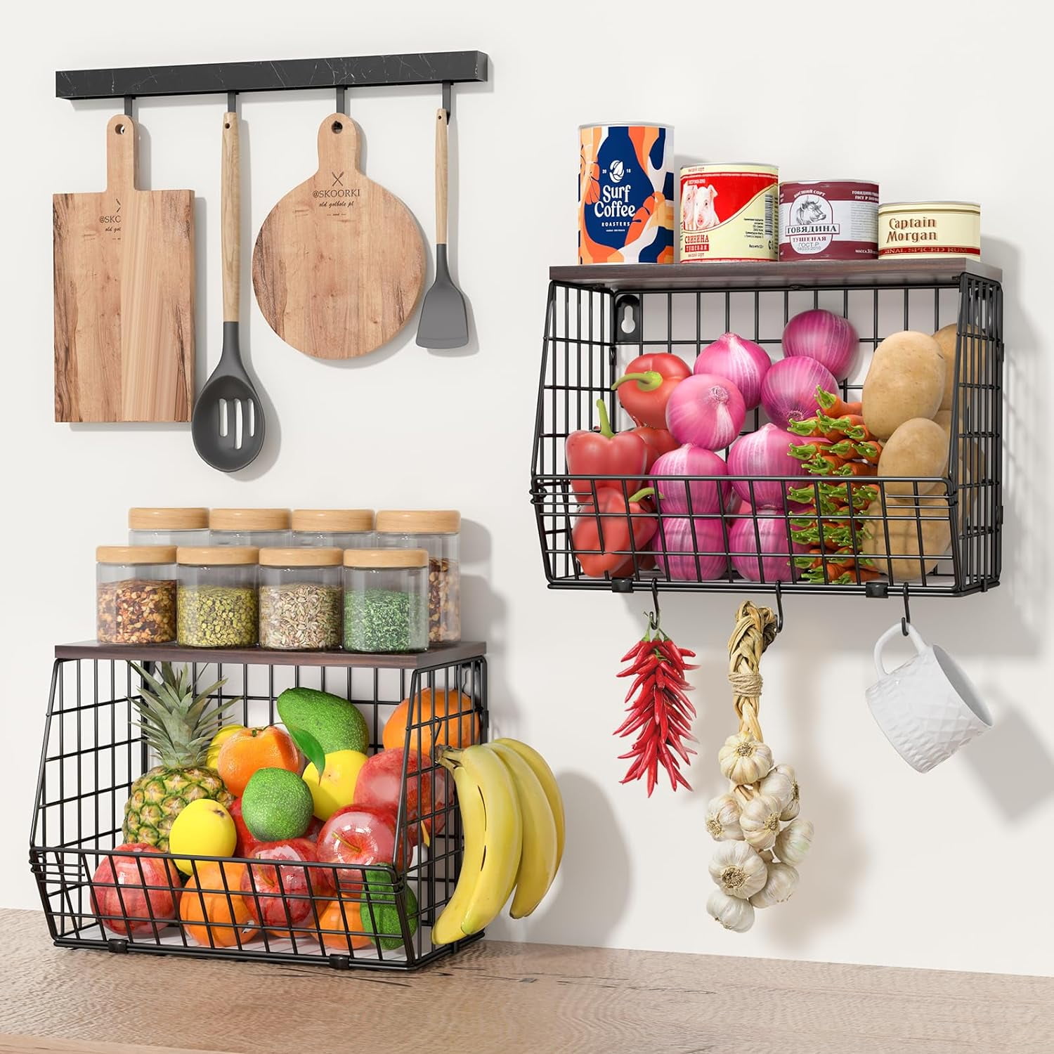 Panier à Fruits Mural Mefirt Corbeille A Fruit, 2 Etages Panier A Fruit, 2pcs Organiseurs De Corbeille Fruit Panier à fruits et légumes, panier de rangement en métal avec crochet FNG8 Bac de Rangeent Epilable Robuste [Lot de 4] - Panier Rangeent... Il est adapté pour stocker des oignons, des pommes de terre, du pain ou des aliments emballés. Grâce à la structure ouverte, vous avez toujours un œil sur le contenu, ce qui réduit l'encombrement et le gaspillage. Ces paniers résistent à une utilisation quotidienne dans des environnements humides tels que les cuisines ou les salles de bain. Empilable et suspension murale : optimisez l'espace de rangement vertical avec ces paniers polyvalents que vous pouvez empiler sur le plan de travail ou les accrocher au mur avec les crochets intégrés (inclus). Chaque panier a une taille de 30,5 x 20,3 cm, 10,16 x 25,4 cm et s'adapte aux étagères standard ou aux tiroirs profonds. Le design léger permet un repositionnement facile en fonction de l'espace. Le design neutre s'adapte à tous les styles de décoration, tandis que les options empilables/murales conviennent aux petits appartements, aux dortoirs d'étudiants ou aux grandes cuisines familiales. Panier de rangement pour fruits et légumes, noir, 4 niveaux, empilable...