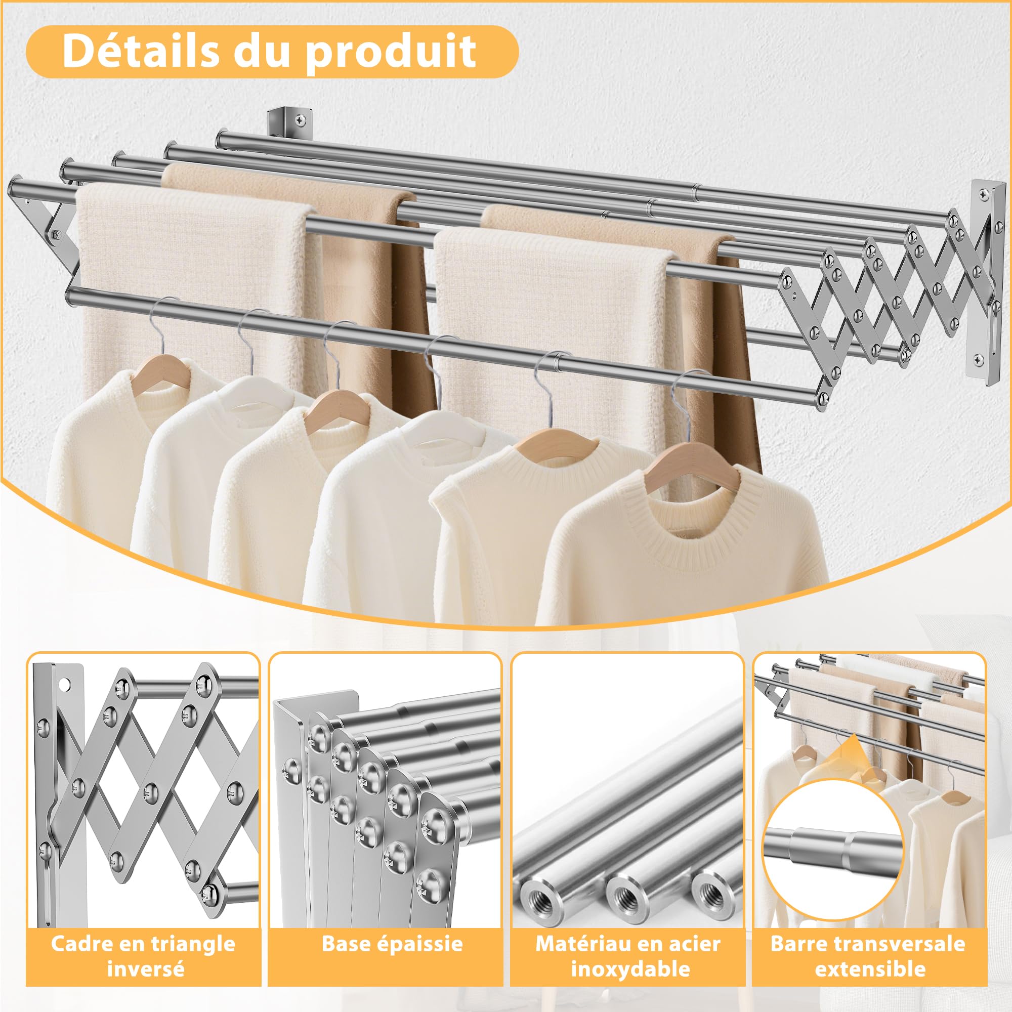 Séchoir Linge Pliable Acier Inoxydable Etendoir À Linge Pliable Levant Gris Acier Inoxydable 16m - Séchoir Et Etendoir Linge Mural Plus produit : - Séchoir pliant fonctionnel pour le linge et les serviettes - Idéal pour les petits espaces - Composé de 7 barres en acier plastifié - Le séchoir peut être facilement retiré du mur ou plié - Couleur : argent - Largeur : 70 cm OUUTMEE 200CM Séchoir à Linge Pliable pour Intérieur et Exterieur Mesurez la distance entre les deux côtés pour vous assurer de la précision, puis utilisez les vis d'expansion incluses pour fixer l'étendoir à linge. Étendoir à Linge Mural Rabattable, 7 Tiges, Acier Inoxydable, Pour Buanderie, Balcon, Salle de Bain · Plus d'information sur le produit vendu 52,80 EUR · Tous les... 👍【Porte-serviettes Polyvalent】Avec 7 barres de suspension (5,6 mètres linéaires), vous n'aurez aucun mal à trouver suffisamment d'espace pour ranger vos vêtements. 💪【Robuste et Durable】Fabriqué en acier inoxydable et soutenu par un cadre en forme de diamant avec des boulons de renforcement, cet étendoir à linge est capable de supporter jusqu'à 25 kg et garantit une durabilité à long terme, ce qui en fait un étendoir à linge idéal pour votre buanderie, votre salle de bain ou d'autres espaces. 🛠️【Installation Facile】 Notre séchoir à linge est livré avec des instructions détaillées et tout le matériel nécessaire pour un processus d'installation unique. Grâce à sa conception réglable, vous pouvez facilement étendre l'étendoir à linge pour les grandes charges ou le rétracter lorsqu'il n'est pas utilisé, offrant ainsi un espace de séchage flexible en fonction de vos besoins.