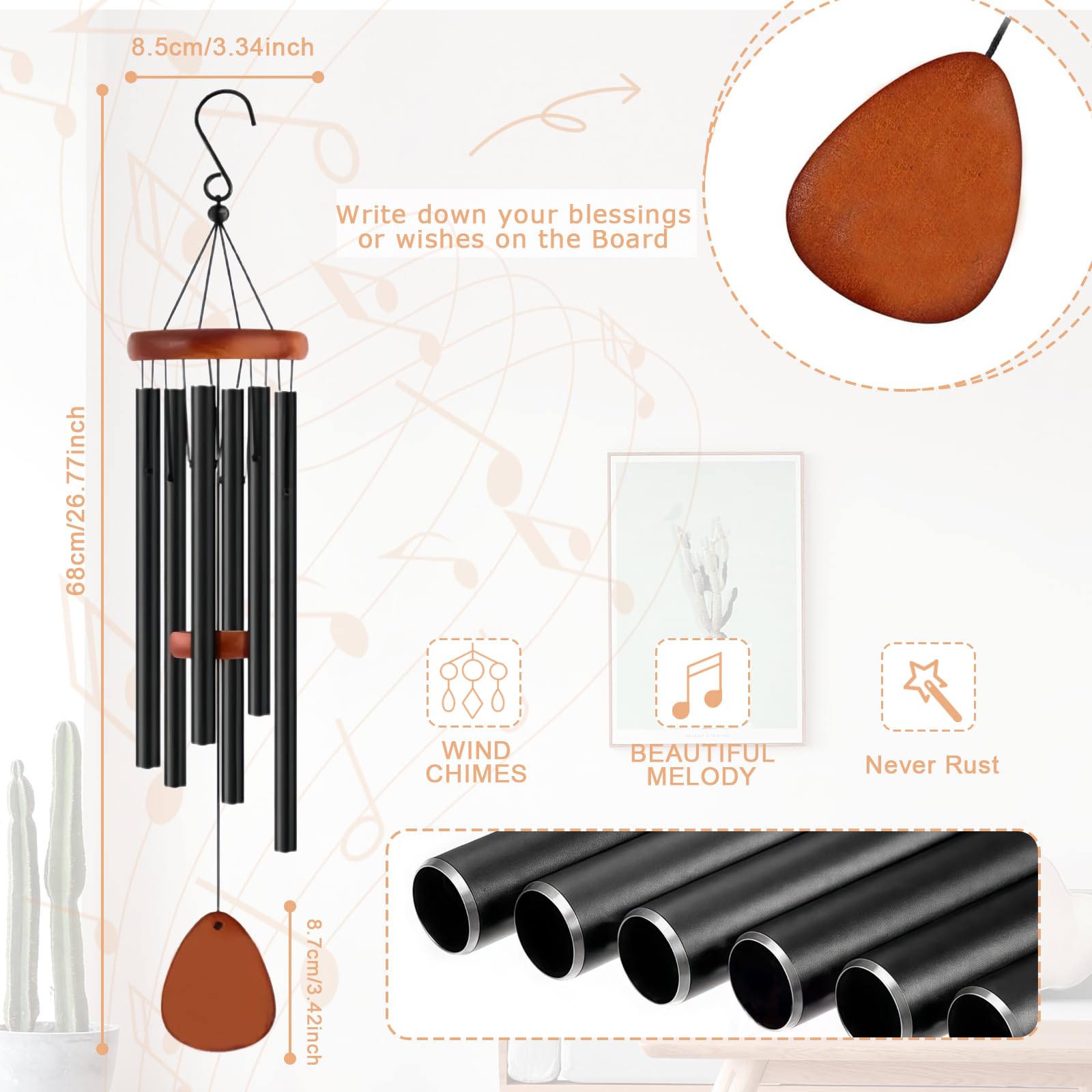 Carillon à Vent Avec Son Apaisant Et Relaxant, 6 Tubes En Aluminium Carillon A Vent Carillons De Vent Pour Exterieur Pour Maison Jardin Cour Balcon Decoration Interieure 92232370 [Décoration Elégante]Doté d’un design moderne et minimaliste, orné d’une couleur élégante, il s’intègre à n’importe quelle décoration intérieure ou extérieure. Carillon Design Moderne Carillon A Vent Exterieur, Carillon à Vent De Jardin 6 Tubes En Angel Chimes Il installe une atmosphère paisible — idéal pour se détendre dans le jardin, savourer un café matinal sur la terrasse ou tout autre moment de tranquillité. Design classique] : Le carillon éolien décoratif est composé de bûches de bois classiques et de 6 tubes en aluminium argenté de différentes longueurs, dansant avec la brise, apportant une belle mélodie à votre maison et créant une atmosphère chaleureuse Carillon A Vent Exterieur,Carillon,Cloche À Eau,Mini Cage À Oiseaux... [Décoration Idéale et Moments de Détente] Que ce soit sur la terrasse extérieure ou dans le salon — ce carillon sonore est non seulement un accessoire décoratif, mais aussi un compagnon dans les moments de détente. Grâce à son design dégagé et intemporel, ce carillon s’harmonise naturellement avec diverses ambiances — qu’il s’agisse d’un jardin moderne, d’une terrasse rustique, d’un balcon minimaliste quel qu’il soit — apportant une touche élégante à tout espace. Pendant le yoga, le repos ou la lecture, il dégage une sérénité douce, installe une atmosphère de détente et apaise le stress. Ce carillon de jardin émet des mélodies harmonieuses qui apaisent l'esprit et soulagent le stress. [Spécifications et Dimensions]Ce carillon en métal comporte 6 tuyaux en aluminium de haute qualité, avec une longueur totale de 68 cm de la suspension à l'extrémité inférieure. Sa conception garantit une protection contre la pluie et la rouille, ainsi qu'une résistance à la décoloration et à la déformation.