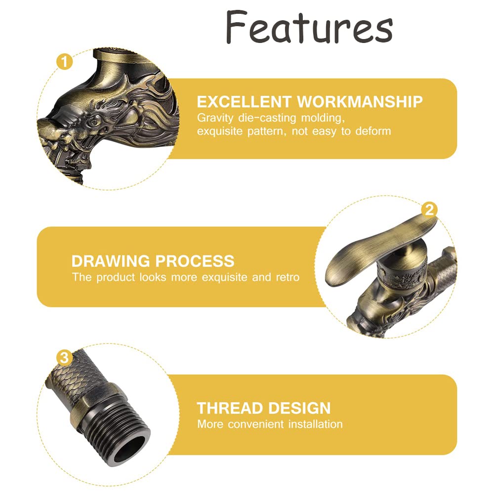 Nizirioo Vintage Robinet en Forme de Dragon Sculpté - Long 1/2 Robinet Fontaine Leruiyezs Robinet Exterieur Jardin,en Laiton Antique,1/2",Mural Robinet Laiton Exterieur CCC robinet de jardin mural décoratif d'extérieur sculpté rétro, Machine à laver, serpillière... Design rétro dragon raffiné et fonctionnel : Ce robinet exterieur séduit par son apparence vintage avec des détails sculptés, idéal pour une fontaine murale ou un robinet de jardin et s'intègre harmonieusement dans des environnements extérieurs classiques ou rustiques Robinet Mural Rétro, Robinet Exterieur Jardin G1-2, Antique Dragon Sculpté Robinet Antique... Utilisation ergonomique au quotidien : Équipé d’une poignée unique facile à manier, ce robinet fontaine permet de contrôler le débit d’eau avec précision, parfait pour une installation murale dans un jardin, une terrasse ou un évier extérieur Facile à installer et à raccorder : Compatible avec la plupart des raccords standards, ce robinet de jardin mural s’installe sans effort à l’aide d’accessoires usuels, ce qui le rend pratique pour une utilisation dans les cuisines, balcons ou machines à laver