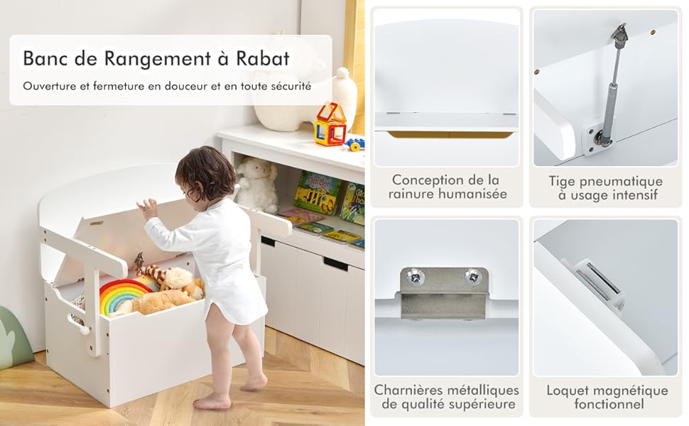 Banc-Coffre à Jouets Woody pour Enfant en Bois - Résistant aux Rayures... La barre pneumatique assure une ouverture et une fermeture lentes du couvercle, évitant ainsi les blessures. Charge maximale de la chaise : 30 kg. Matériau de haute qualité et sûr : le salon de jardin flexible en bois est conçu pour les enfants âgés de 3 à 7 ans. Contenu de la livraison : 1 kit d'activités 3 en 1., 1 manuel d'utilisation (français non garanti). Description: Vous en avez assez du désordre ? Notre kit d'activités est le compagnon idéal pour les enfants âgés de 3 à 7 ans. Design convivial : avec deux poignées, le salon est facile à transporter, et la barre pneumatique empêche la fermeture brusque de la caisse. 2 en 1 table d'activités modulable - Infantino ance Ensemble de table d'activité 3 en 1 : ce meuble polyvalent pour enfants peut être utilisé de manière flexible comme table ou chaise. Beaucoup d'espace de rangement à l'intérieur pour les jouets, les livres, les vêtements. Meuble Rangement Enfant FANTASK Coffre à Jouets 3 En 1 - Table D'activité Pour Enfants - En Coffre De Rangement En outre, le matériau de qualité supérieure est très durable. Assemblage facile avec instructions détaillées (français non garanti). La grande boîte de rangement garantit l'ordre. Coffre à Jouets Rhino 3 Sprouts - Petit Prix Grand espace de rangement : avec des dimensions de 54,5 x 31 x 21 cm (L x l x H), la table pour enfants offre suffisamment d'espace pour les vêtements, les livres, les jouets et plus encore. Dimensions du banc : 60 x 34 x 57 cm Dimensions de la table avec chaise : 60 x 56,5 x 43,5 cm Charge maximale de la table : 10 kg. Montage et nettoyage faciles : grâce aux instructions claires et aux accessoires assortis, le montage est rapide. Ainsi, l'environnement reste bien rangé - Idéal pour les jardins d'enfants, les salles de jeux et les pièces similaires. Convient aux enfants de 3 à 7 ans. La transformation entre la table et la chaise est également simple – également utilisable par les enfants.