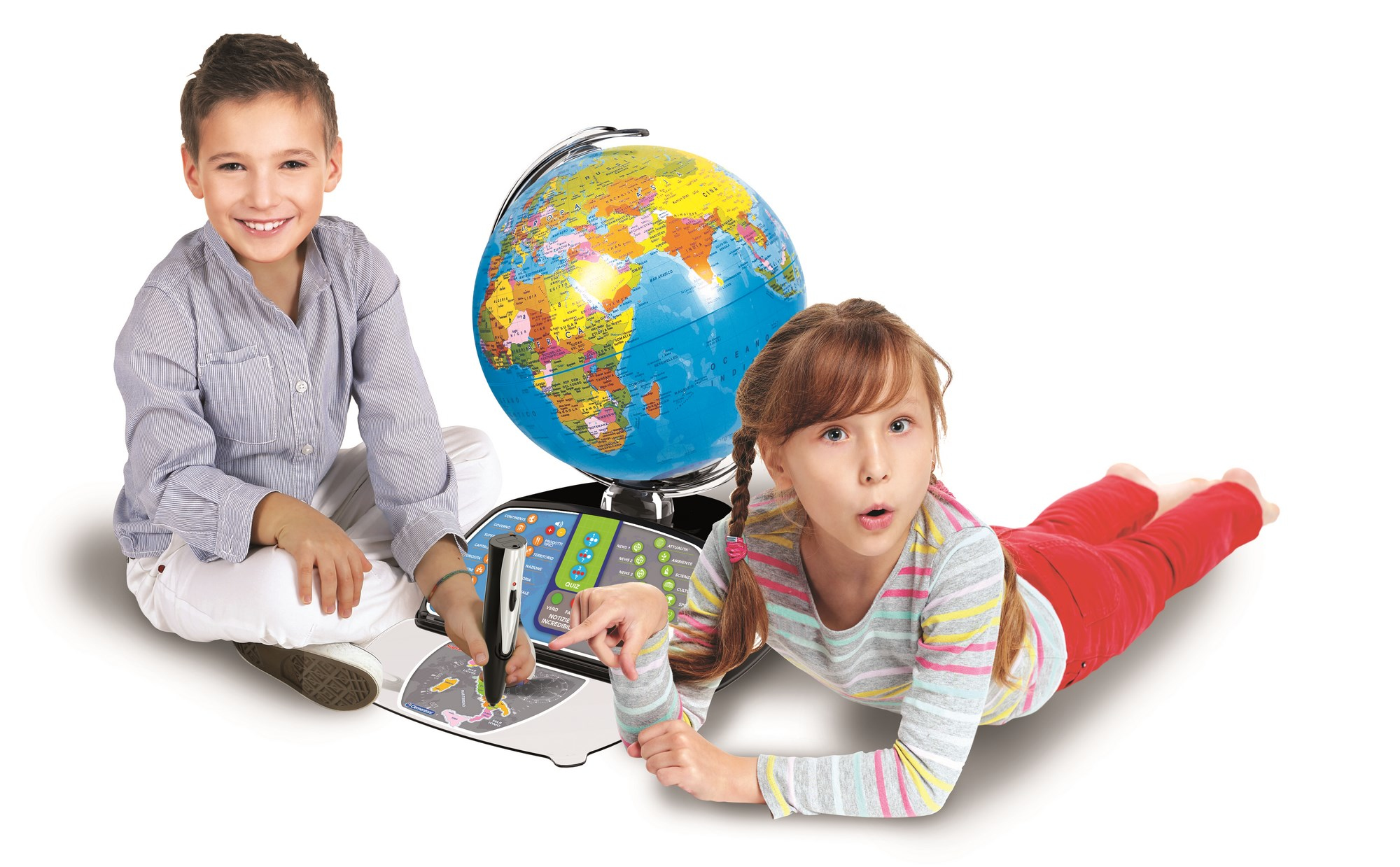 CLENTONI EXPLORAGLOBE CONNECT - LE GLOBE - Globe terrestre enfant Dès 3 ans, votre enfant pourra explorer le monde avec ce globe terrestre interactif de la marque Clementoni. Ce globe interactif électronique en plastique recyclé, avec des continents et des animaux à encastrer, permettra à votre enfant de tout savoir sur les animaux et leur habitat Globe électronique Quiz Enfant CLEMENTONI MY FIRST GLOBE MON PREMIER GLOBE ÉLECTRONIQUE PARLANT Globe Terrestre Clementoni 3 Ans Description du produit Un globe électronique, fabriqué à partir de plastique recyclé, avec des continents et des animaux à assembler et apprendre de nombreuses curiosités à leur sujet et leur habitat. Le plaisir se poursuit avec le jeu de route coopératif, dans le but de voyager dans le monde entier avant l'arrivée de la tempête, en répondant aux questionnaires proposés par le globe. Clementoni Exploraglobe Connect - Le Globe Interactif Évolutif au... Le ballon offre également des quiz amusants auxquels l'enfant peut répondre en insérant le bon animal dans la base du ballon. Avertissement De Sûreté Non applicable Jouet en espagnol, à partir de 3 ans., Fabriqué en Italie Le plaisir continue avec le jeu de route coopératif, dans le but de voyager dans le monde entier avant l'arrivée de la tempête, en répondant aux questionnaires offerts par le globe