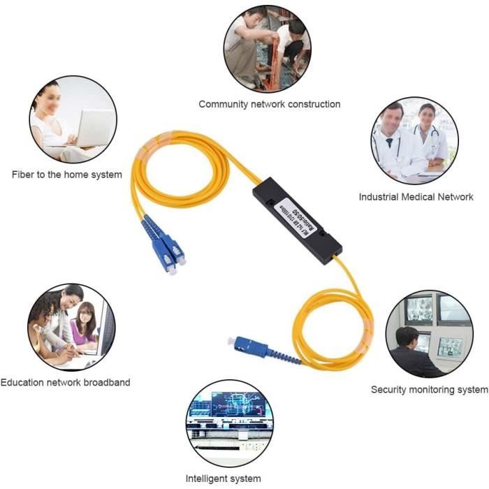 Température de fonctionnement : de -40 à 85 °C. Cordon jarretière Fibre Optique SC APC / SC UPC pour Box - Freebox - 2... Contenu : 1 répartiteur PLC à fibre optique SC/APC avec insert de type 1 x 8 Longueur d'onde en fonction de la perte : 0,6 dB. Répartiteur Domestique Projet Réseau LAN Séparateur De Fiber Optique FTTH 1x4 SC /APC, Coupleur Optique FBT 1:4 Splitter SC/APC Monomode 1260-1650nm Dimensions : 113 x 112 x 25 cm., Poids : 116 g. Type d'interface : SC/APC Longueur d'onde de fonctionnement : 1260-1650 nm. Caractéristiques : Faible perte d'insertion, faible PDL., 2., Design compact, bonne uniformité de canal à canal., 3., Haute fiabilité et stabilité. Répartiteur PLC 1 x 8., Le type d'interface est SC/APC, rapide et pratique. Structure entièrement en fibre, stable et rapide, puce intégrée de haute qualité, assure une répartition uniforme et stable de la lumière, réponse rapide sans délai, ce qui peut répondre aux besoins de différentes longueurs d'onde Perte de retour : ≤ 55 dB., Direction : ≤ 55 dB., Uniforme spectrale : ≤ 0,6 dB. Stabilité de la température : ≤ 0,6 dB. Câble Fibre Optique ADSS 48 Brins Monomode Perte d'insertion : ≤ 7,5 dB. Coque en plastique ABS, avec résistance aux chocs, à la chaleur et aux basses températures. Répartiteur PLC à fibre optique pour réseau PON en FTTX