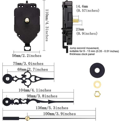 * Température de fonctionnement : -10 °C ~ 50 °C. La tige de 20 mm (filetage de 11,1 mm) convient pour les panneaux d'horloge de 10 mm d'épaisseur. Mecanisme Remplacement FUBESK Mouvement D'horloge à Quartz De Rechange à Long Axe Trotteuse Continue ouveent à Quartz, ouveent Super Silencieux pour Horloge urale... La tige de 23,5 mm (filetage de 15,1 mm) convient pour les vitres d'horloge de 14 mm d'épaisseur. Caractéristiques : * Produit de qualité supérieure. Tige de 14,8 mm (filetage de 6,1 mm) adaptée pour un panneau d'horloge de 5 mm d'épaisseur. * Fabriqué à partir de matériaux de haute qualité, durable et fiable * Couple d'aiguille des secondes : 0,6 (gf - cm). * Mouvement parfait pour réparer, remplacer ou faire une horloge. * Matériau : métal, plastique. Tige de 12,4 mm (filetage de 4,5 mm) adaptée pour un panneau d'horloge de 3 mm d'épaisseur. Kelisdi Mécanisme d'horloge à couple élevé sans tic-tac - Kit de moteur * Caractéristiques de l'aiguille des secondes : Longueur ≤ 130 mm / Poids ≤ 2 g/ Torsion sans équilibre ≤ 0,15 g-cm. * Mouvement silencieux, super silencieux, ne perturbe pas le sommeil * Il y a 2 types de mouvement : pas de type à clic, type de tige filetée. * Il y a 6 types de mouvement avec différentes longueurs de tige : le mouvement de type encliquetage de 8,9 mm est adapté pour les petites horloges ; tige de 12,4 mm (filetage de 4,5 mm) convient pour un panneau d'horloge de 3 mm d'épaisseur ; tige de 14,8 mm (filetage de 6,1 mm) convient pour un panneau d'horloge de 5 mm d'épaisseur ; tige de 17 mm (filetage 8,6 mm) convient pour un panneau d'horloge de 7 mm d'épaisseur.