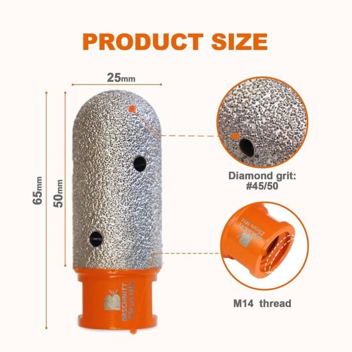 VENJELD Fraise à doigt diamantée 15 mm pour carrelage avec tige hexagonale pour agrandir les trous, façonner, polir, poncer sur céramique, porcelaine... Le bord du trou est lisse après meulage. 【Dissipation thermique efficace】La conception du trou d'évacuation des copeaux réduit efficacement les résidus de débris et la génération de chaleur pendant le travail, permettant un fonctionnement continu sans blocage et améliorant l'efficacité du travail. Foret Ceramique HIGHDRIL Fraises Diamantées 10mm Pour Agrandir Meuler Et Façonner Les Trous Existants Dans Carrelage Porcelaine Céramique Marbre Granit Maçonnerie Comptoir Pierre M14 Filetage Foret Diamant Carrelage 6mm Leur grain de sable moyen à grossier assure une force de coupe élevée sans endommager le matériau. M14 Mèche à Chanfreiner Biseautée Mèche à Fraiser à Angle De Base De 60... 【Une seule perceuse pour de multiples usage】Avec seulement un foret à trou et un foret diamanté en forme de doigt, vous pouvez créer des trous de n'importe quelle taille sans avoir besoin d'acheter plusieurs forets de dimensions différentes, ce qui permet de réduire efficacement les coûts. Fraise diamantée 10 x 30mm Dry Speed Bosch | Trépan | FR