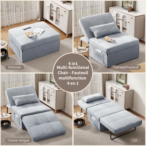 Compact en position fauteuil et spacieux en position lit (dimensions lit: 190x60 cm), il est le compagnon idéal pour accueillir vos invités ou vous créer un coin détente unique. Fauteuil Réglable Positions Fauteuil Convertible à Lit 1 Place Fauteuil De Salon 4-en-1 Dossier Réglable En 6 Positions Avec Oreiller 7 Couleurs Au Choix Housse Amovible Lavable 💺 【Confort Personnalisé & Ergonomique】- jusqu'à 0 - 180° pour la position lit. Mingone Canapé lit 3-en-1 Pliable Convertible, Chauffeuse 1 Place avec Mousse à Mémoire de Forme et Oreiller, Fauteuil lit Idéal pour Petit Espace, Salon, Chambre ou Bureau L'alliance des accoudoirs en métal élégant ou en bois de chêne avec une structure cadre en métal robuste lui confère une esthétique à la fois chic et durable. 🧼 【Entretien Facile & Pratique au Quotidien】- La vie est plus simple avec ce canapé-lit 1 place. Transformez facilement ce fauteuil convertible 1 place élégant en un confortable lit d'appoint. Fabriqué à partir d'un cadre en acier robuste, rembourré et tapissé d'un agréable tissu velouté, ce canapé-lit 1 place de est idéal pour tous les environnements. Il est également doté d'un dossier inclinable en 5 positions avec un angle maximal de 180°, pour vous permettre de... Le revêtement en lin effet est incroyablement doux au toucher, respirant et déhoussable pour un entretien facile. La mousse haute densité et l'épaisse assise de 10 cm garantissent un soutien idéal pour un bien-être incomparable. Le coussin / oreiller inclus, également avec housse lavable, ajoute une touche cosy et de confort supplémentaire pour votre cou ou votre dos. Costway Fauteuil Convertible 1 Place Fauteuil-Lit Chauffeuse 4en1 🛋️ 【Matériaux Haut de Gamme & Élégance】- Appréciez la qualité supérieure de ce fauteuil-lit. Ses pieds antidérapants et sa structure stable supportent jusqu'à 100 kg.