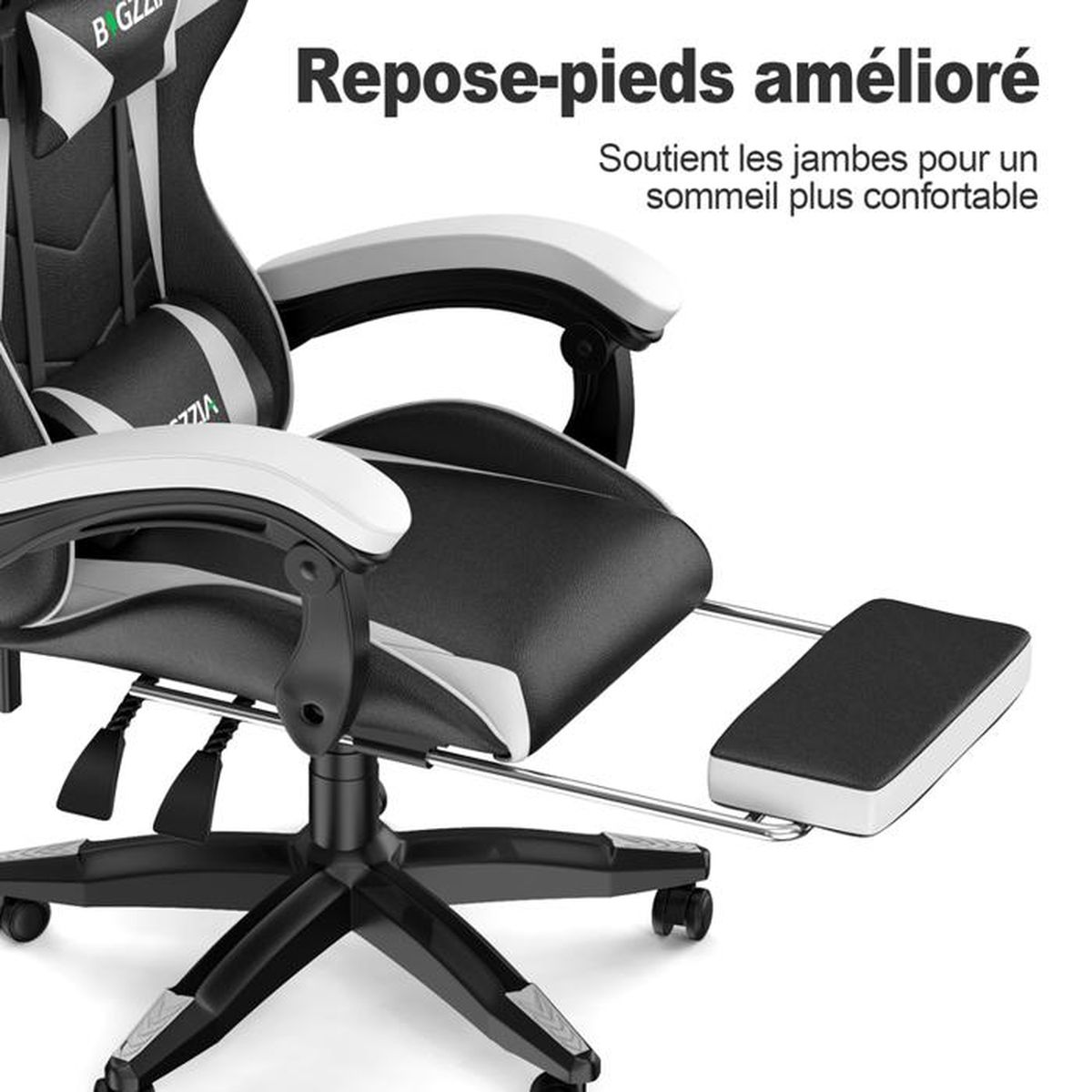 Chaise Similicuir 130kg Fauteuil De Gaming Ergonomique | Fauteuil De Bureau - Avec Repose-pieds Fauteuil Bureau Inclinable Chaise de bureau symino gaming Cha Gaming, Fauteuil Gaming Ergonomique avec Accoudoirs Rabattables... Le rembourrage premium à ressorts ensachés garantit un soutien et un confort optimal, même lors d'utilisations prolongées Liberté de mouvement totale: Repose-pieds intégré pour les moments de détente. Inclinez simplement le dossier à l'angle désiré pour adapter instantanément votre position selon votre activité ou votre envie du moment Ergonomie haut de gamme: Le dossier ergonomique épouse la courbe naturelle de votre dos, répartissant uniformément la pression sur le cou, les épaules et la région lombaire. Le vérin à gaz de classe 3 permet un réglage précis de la hauteur (jusqu'à 8 cm) pour s'adapter parfaitement à votre morphologie (charge max recommandée : 130 kg). Montage rapide & service client dédié: Assemblage simple et rapide (environ 10-15 minutes) grâce aux pièces, outils et instructions détaillées incluses (multilingues, disponibilité du français sous réserve). Notre service client est disponible 24h/24 pour répondre à vos questions ou résoudre tout problème, assurant votre satisfaction complète Son design de style course, son repose-pieds intégré et ses accoudoirs réglables te permettent de rester installé des heures sans fatigue. Solide, stable et capable de supporter jusqu'à 200 kg, elle allie ergonomie, robustesse et mobilité grâce à sa rotation 360