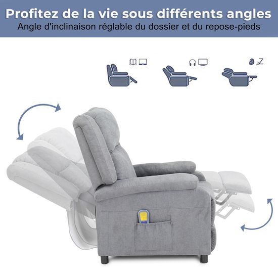 Fauteuil Relax Fauteuil De Relaxation électrique Releveur En Tissu Anthracite - EVORA | Maison Et Styles Fauteuil Relax électrique Fauteuil de relaxation 360 électrique polaire Teddy, fauteuil pour personne agée avec fonction... Fauteuil relax électrique meubles Oléron Lamballe et Matignon 【Design ergonomique】Tissu en lin respirant, rembourrage épais, porte-gobelets et poche latérale pour un rangement pratique Rotation à 360°]Ce fauteuil de massage peut pivoter à 360 degrés et s'incliner vers l'avant et vers l'arrière, ce qui augmente le confort et le plaisir... 【Assemblage rapide】Livré en 2 colis, pas besoin d'outils, montage simple en quelques étapes 【 Rotation à 360°】Ce fauteuil de massage peut pivoter à 360° degrés et s'incliner vers l'avant et vers l'arrière, ce qui augmente le confort et le plaisir, et peut vous permettre de vous détendre facilement lorsque vous êtes fatigué 【Sac de rangemen】Ce fauteuil de massage relaxant est livré avec un sac de rangement intégré qui peut être utilisé pour ranger des télécommandes, des magazines ou d'autres objets Boîte A : Coussin d'assise et accessoire Boîte B : Dossier et accoudoirs
