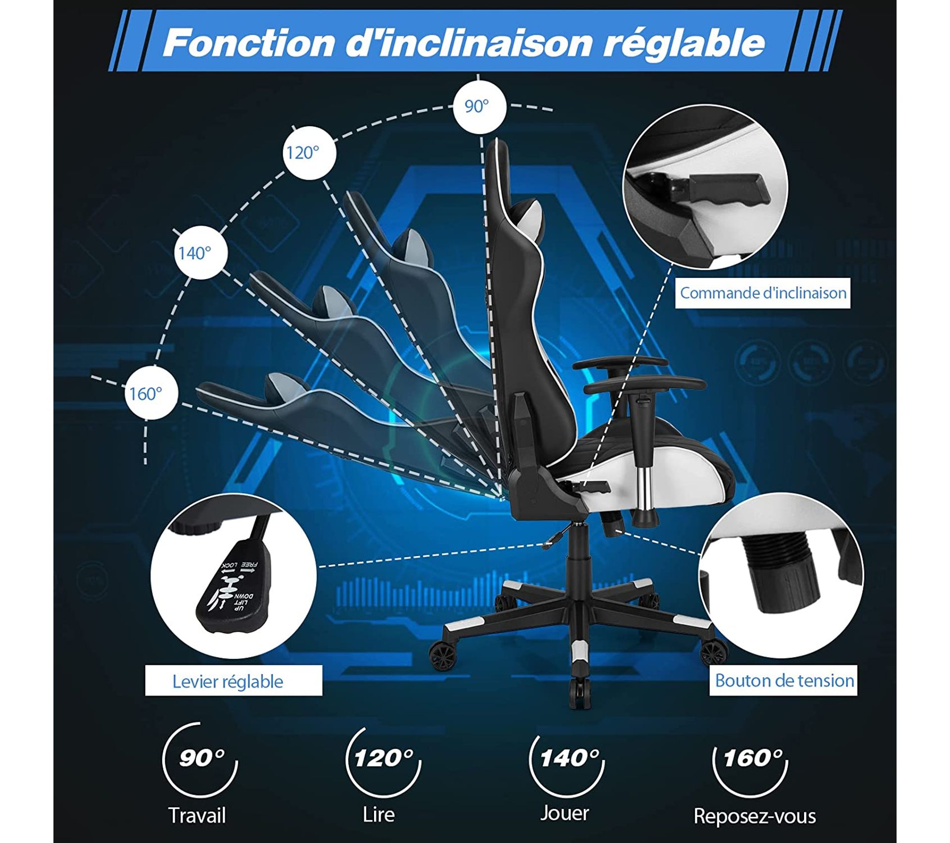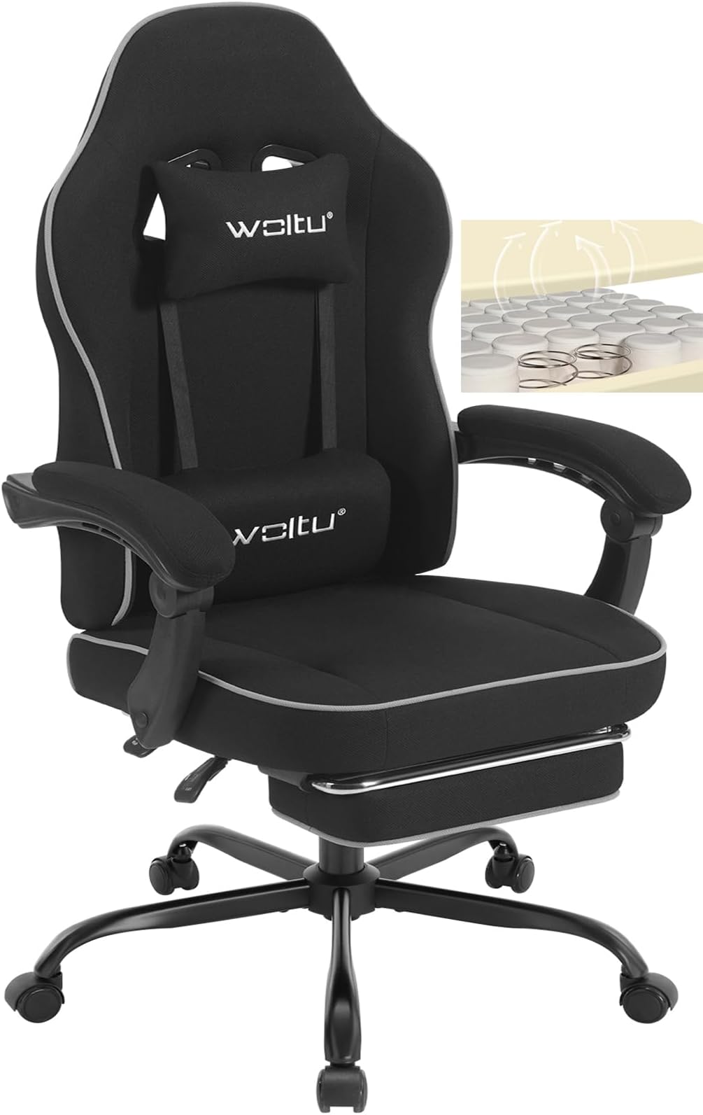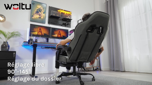 WOLTU Chaise de bureau Racing chaise, Fauteuil de bureau en tissu Il se conforme dynamiquement aux courbes du corps, pour réduire la fatigue et offrir une assise confortable Fauteuil Gaming Ergonomique WOLTU Dossier Inclinable Chaise Gaming,Fauteuil Gamer Ergonomique Avec Repose-pieds,Charge 150KG Chaise Gamer Accoudoirs Liés Vous pouvez bénéficier toujours d'un soutien confortable en position assise ou allongée Réglable en hauteur: La hauteur d'assise est réglable de 45.5 à 53.5 cm pour différentes hauteurs de table et tailles.Fonction chaise longue: Dossier inclinable de 90° à 145°. pour se pencher en arrière de manière détendue pendant les pauses de travail ou de jeu.Repose-pieds extensible: Pour servir à détendre les jambes et les pieds. Il peut être repoussé de manière pratique... Siège de massage ergonomique : siège large sans ailes et dossier évasé pour un ajustement optimal du corps - Appuie-tête flexible et soutien lombaire... Le tissu en suède est respirant, doux pour la peau et confortable Ce fauteuil de course offre un soutien complet de la tête aux pieds, soulageant rapidement la fatigue et offrant une sieste reposante MOBILITÉ SILENCIEUSE : Équipée de roulettes silencieuses en caoutchouc PU et d'une base épaissie à 5 branches, cette chaise gamer se déplace en douceur et en silence, protège les sols des rayures, permet d'ajuster la position sans déranger les autres. ACCOUDOIRS RELIÉS : Le fauteuil gaming est doté d'un dossier réglable de 90° à 135°. SOULAGER LA PRESSION PAR ZONES : L'assise en éponge moulée de la chaise bureau offre un soutien souple et résistant à l'affaissement, tandis que le dossier rempli d’éponge à haute résilience s'adapte à votre corps de manière dynamique. Il y a du bruit pendant le glissement.