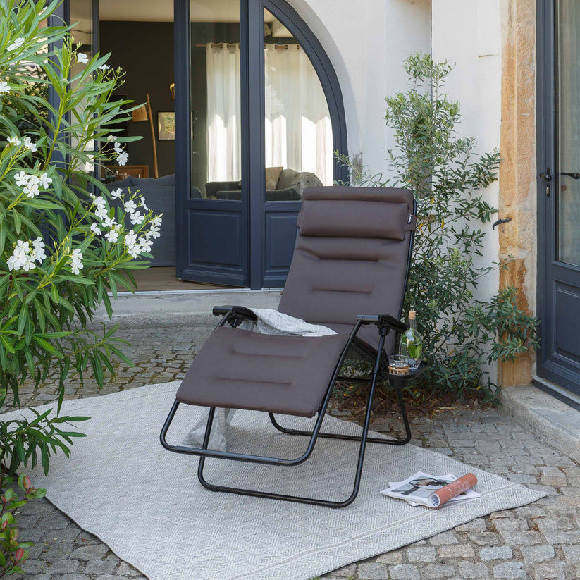 Dimensions du fauteuil de relaxation ouvert : 87 à 123 x 72 x 96 à 174 cm. Il vous fournit tout l’espace nécessaire pour vous prélasser au soleil dans votre jardin, en terrasse, au bord de la piscine ou vous reposer dans votre salon. LAFUMA MOBILIER : Fabricant français de mobilier d'extérieur depuis 1954., Avec LAFUMA MOBILIER, optez pour le confort et la qualité. Découvrez notre sélection exclusive de fauteuils de relaxation pour un confort optimal ! Transformez votre jardin en oasis de détente De plus, sa peinture 100% polyester haute tenue aux UV lui confère une résistance optimale aux rayons ultraviolets et à la pluie. CHAISE LONGUE PLIANTE XL TOUT CONFORT : Détendez-vous avec ce fauteuil de relaxation de fabrication française. Fauteuil Relax Transat Jardin - Chaise Longue Matelassé Zéro Gravité - Xl - Rsx Clip Xl... Idéal pour les grands gabarits et les personnes de plus de 1., 80m, il vous fournit tout l’espace nécessaire pour vous prélasser au soleil ou vous reposer dans votre salon. Vous ne pourrez plus vous en passer ! Transat Jardin Exterieur Fauteuil Relax Zéro Gravité Rsxa Clip Batyline® Iso Marron Graphite Tube Titane Lfm2055 8717 Chaise Longue Lafuma Rsx Clip Xl Position réglable avec stabilisateurs. Transat possédant le label Longtime®, garantissant sa robustesse, sa longévité et sa réparabilité. Toile résistante aux UV et aux intempéries, qui sèche rapidement. TOILE MATELASSÉE AIRCOMFORT : Respirante, la toile matelassée amovible AirComfort se fixe et se retire en toute simplicité via les clips en élastomère breveté qui montent jusqu’aux épaules pour un excellent maintien du dos. Transat pliant avec bague de protection repose pieds et patins de pieds. Transat possédant le label Longtime, garantissant sa robustesse, sa longévité et sa réparabilité. Avertissement De Sûreté Ne pas utiliser la chaise avec une charge supérieure à 150 kg Têtière réglable et amovible. Profitez de moments relaxants avec la position Zéro Gravité qui permet de placer les jambes au-dessus du niveau du cœur, dans un angle de 127° idéal pour une bonne circulation sanguine. Description du produit Ce transat pliant fabriqué en France se compose d’une structure solide en acier HLE (Haute Limite Élastique) avec peinture 100% polyester résistante aux UV et aux intempéries, et d’une toile matelassée AirComfort® au coussinage 3 épaisseurs (1 couche 3D Mesh, 1 ouate respirante et perméable, 1 couche Batyline®) fournissant une assise confortable et relaxante. Son format XL possède une taille plus longue et plus large que le RSX CLIP classique. Marque française créée dans la Drôme, à Anneyron, nous mettons notre savoir-faire au service d’un mobilier pratique, réparable et durable qui associe style et confort. Fauteuil Relax Pliant Matelassé Decathlon LAFUMA MOBILIER Transat Ce transat multiposition XL possède une taille plus longue et plus large que le RSX CLIP classique.