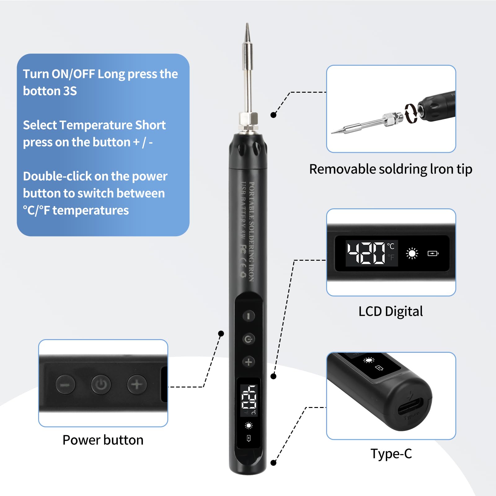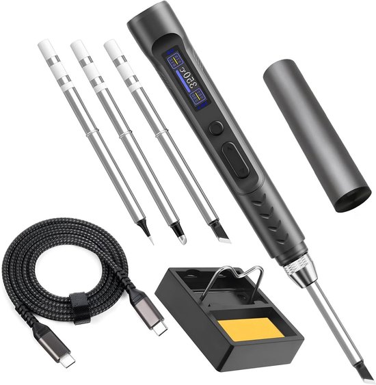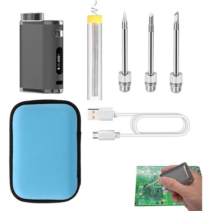 diymore Ensemble de fer à souder sans fil USB-C avec écran LCD Écran LCD et contrôle précis de la température : l'écran LCD haute résolution affiche la température actuelle de 180 °C à 450 °C. Kit électronique Fer Soudure Température Réglable Fer à Souder Sans Fil Diymore - USB-C - Écran LCD - Température Réglable 260-420°C - Portable Pour électronique Kit Soudure électronique Imprimante Sans Fil Pas de câbles gênants - Parfait pour une utilisation en déplacement ou en atelier. Tête de fer à souder plug-and-play en une seule pièce, facile et pratique à utilr pour répone à différents besoins de soudure.Petit fer à souder : le fer à souder USB dispose d'une batterie intégrée de 1400 mAh qui vous libère des câbles et permet une utilisation plus libre et confortable Set-bck - Fer à souder sans fil Rechargeable usb 510, interface, tête... Diverses applications : électronique, bricolage, réparation : convient pour les circuits imprimés, les bijoux, les guitares, les montres, les appareils ménagers et les petits appareils électroniques. Fonctionnement simple : maintenez pendant 3 secondes pour allumer/éteindre et appuyez brièvement pour régler la température. Ne convient pas aux projets de haute puissance. 【Fonctionnement sans fil portable】Le fer à souder est équipé d'une batterie de 1100 mAh qui peut être chargée via USB-C (5 V/2 A). Poignée résistante à la chaleur et design ergonomique : la poignée en TPE isole efficacement la chaleur et offre une prise en main antidérapante, assurant un fonctionnement précis. 1 Fer a souder sans fil 2 Fer a souder sans fil