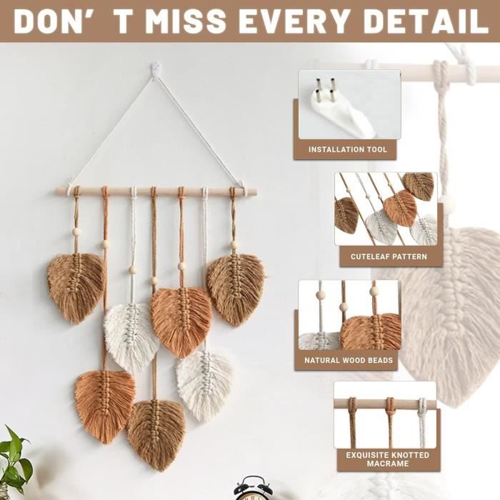 🍃Conseils : Un film protecteur transparent est placé au dos de la feuille pour préserver sa forme. 【Tissage artisanal】 : Confectionnée avec soin à partir de corde en coton de qualité supérieure et de bâtons de bois, cette tenture murale en macramé témoigne d'un savoir-faire artisanal. Idéale pour embellir des espaces comme les mariages, les séances photo, ou comme point focal accrocheur dans votre chambre ou votre salon. 🍃Cette tapisserie tissée sera un cadeau élégant et pratique pour votre famille ou vos amis, et sera également idéale pour une pendaison de crémaillère, un anniversaire, un mariage, les fêtes, etc. Tenture murale en macramé à feuilles - France 【Décoration murale élégante】 : Transformez votre espace avec cette magnifique tapisserie en macramé. Cette tapisserie est idéale pour une chambre, un salon, une chambre de bébé, un espace de travail ou tout autre espace où vous souhaitez apporter texture et originalité à vos murs. Sollbry Feuille Macramé Tenture Murale Boho Room Home Decor Tissé... 【Décoration polyvalente et idée cadeau】 : Mesurant 80 x 40 cm, cette décoration murale verte est parfaite pour de nombreux espaces, comme au-dessus d'un lit, d'un berceau, d'une cheminée ou d'une galerie murale. Caractéristiques :🍃Cet article fait main, avec son design symétrique, s'intègrera à tous les intérieurs. 【Tapisserie bohème en forme de feuille】 : Composée de dix feuilles élégantes ornées de pompons classiques, cette tapisserie murale est une pièce maîtresse. Décoration Murale Boho Chic Fait Main Suspension Murale En Macramé Avec Feuille De Monstera : Décoration Bohème Pour Chambre D'enfant - France Décoration Extérieur Bohème Chic Macramé Main Décoration Salon Apportez une touche artistique et chaleureuse à votre intérieur avec le Tissage Mural Macramé Feuilles de Tenture Art Murale, une œuvre artisanale inspirée par la nature qui crée une atmosphère apaisante et boho, parfaite pour sublimer votre décoration 【Entretien facile】 : Les légers plis dus au transport sont faciles à gérer.