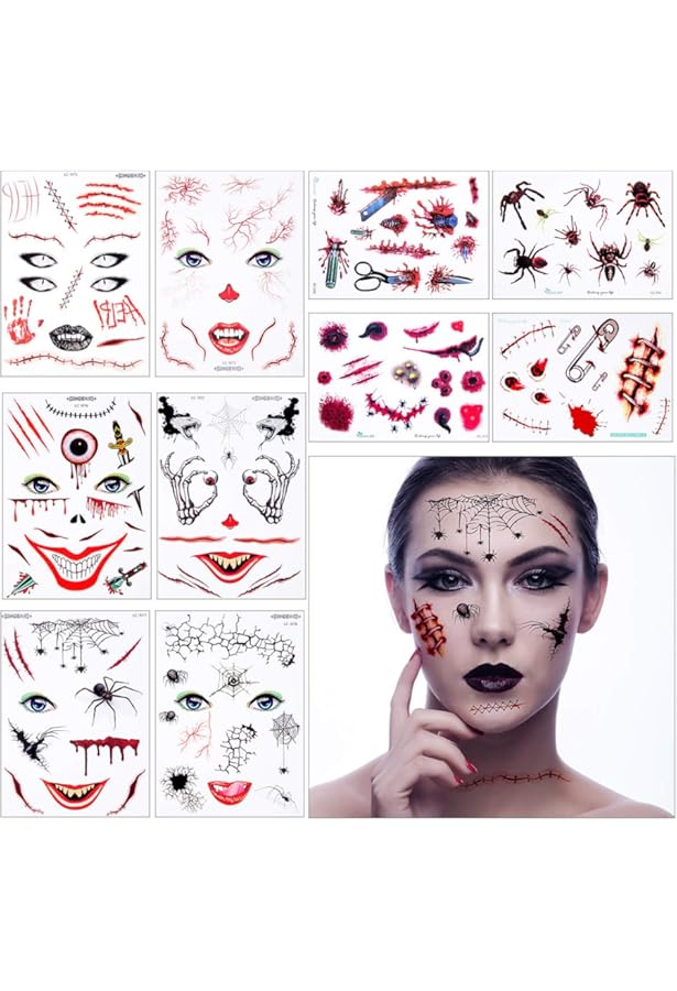 Kit de tatouage pour Halloween, 10 feuilles de tatouages temporaires Application du tatouage cicatrice : vous pouvez le coller sur le visage, les bras, les épaules, les jambes, toutes les autres parties du corps. Décoration parfaite : meilleurs cadeaux d'Halloween et accessoires trompeurs pour les fêtes d'Halloween, les fêtes d'horreur, les jours de zombie, les jeux de rôle, les fêtes costumées, les... Kit Maquillage Visage Halloween 10 Feuilles De Halloween Tatouages Temporaires, Tatouage Tatouages Cicatrices Halloween Accessoires complexes de zombies, démons et vampires faciles et rapides à appliquer. Ils peuvent être utilisés sur le visage, les bras, les épaules ou d'autres parties du corps, mais ne sont pas recommandés pour les enfants de moins de 3 ans ou les personnes à la peau sensible. Application multiple tatouages temporaires D'araignée et tatouage temporaire de cicatrice, bon accessoire pour votre costume de fête, idéal pour la fête D'Halloween, les costumes D'Halloween, le costume D'araignée, le jour des morts, la fête de nuit, le carnaval, le diable de maquillage, les soirées à thème, Les Nuits de club... 【Matériau sûr】Nos Temporaires Tatouage Halloween sont fabriqués à partir de matériaux non toxiques, résistants à l'eau et à la transpiration, doux pour la peau et durables. 【Facile à coller et à retirer】Il suffit de découper le motif à coller, de déchirer la protection transparente et de placer le Visage Halloween Zombie Vampire (côté motif) sur la peau, d'humidifier le Maquillage Halloween avec de l'eau, puis de le coller., Attendez 30 à 50 secondes. Ils peuvent être utilisés sur n'importe quelle partie du corps, comme le visage, les bras, le cou, etc. 【Largement répandu】Les Cicatrice Halloween Tatouages présentent une multitude de motifs effrayants, parfaitement adaptés aux Halloween Zombie Scars Tattoo, aux fêtes costumées, à la nuit des morts, au carnaval, aux fêtes masquées, aux soirées à thème et à la Toussaint.