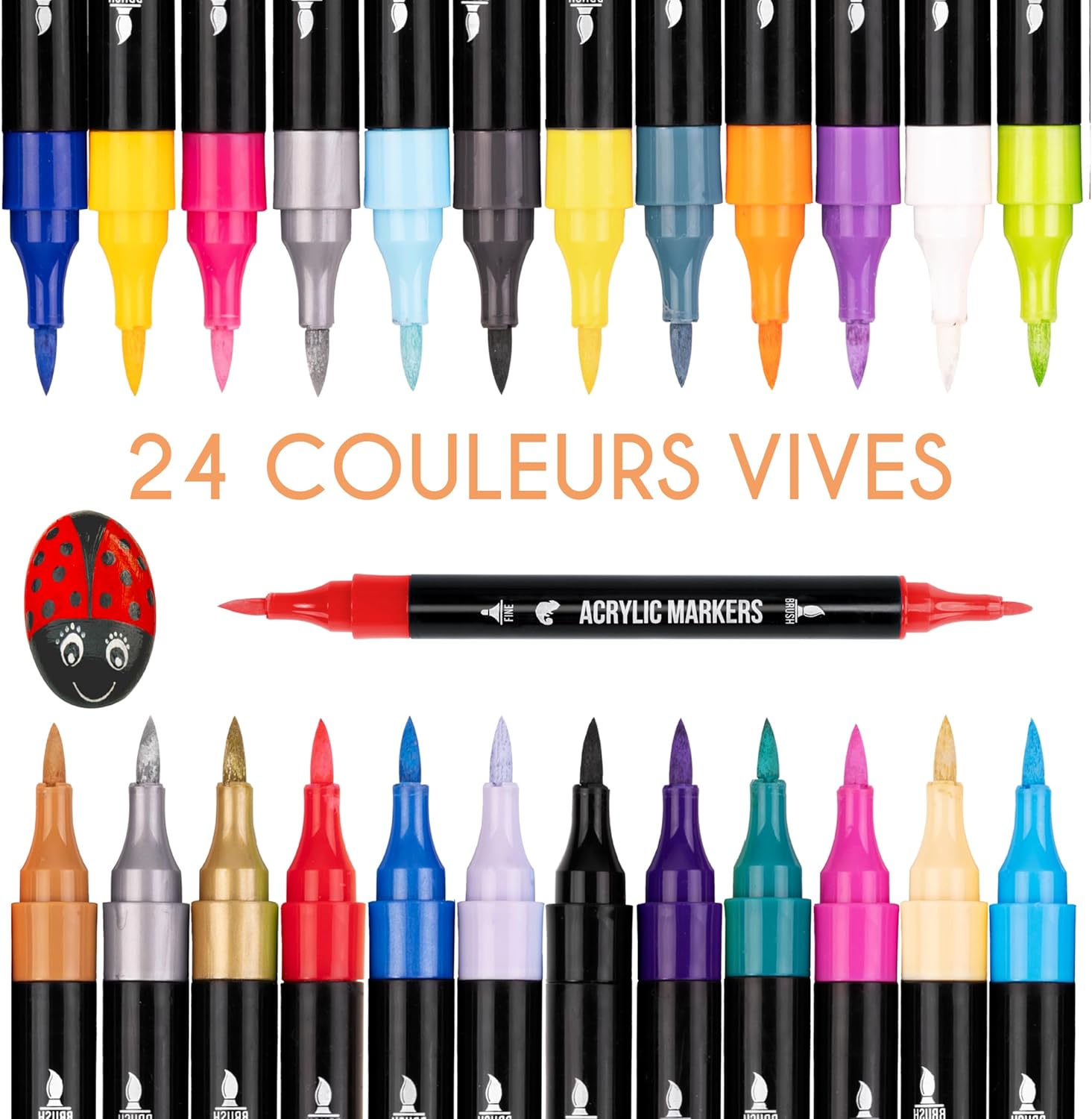 48 couleurs vibrantes et couvrantes : Ce set de marqueurs acryliques offre 48 teintes pigmentées pour un rendu intense. Utilisables sur papier, bois, galets, tissu, verre, céramique… Parfaits pour le coloriage mystère, les décorations ou le DIY. Deux pointes, mille possibilités Ces acrylic paint marker garantissent un tracé net, sans bavure ni surcharge. Convient aux adultes et adolescents pour une utilisation propre à la maison, à l’école ou en atelier. Séchage rapide, sans odeur forte : L’encre sèche en quelques secondes pour éviter les bavures et ne dégage aucune odeur désagréable. Est-ce adapté pour les enfants ? Tout à fait. Pointe pinceau - Parfaite pour les dégradés, la pointe pinceau glisse avec fluidité pour des effets riches et expressifs. Le feutre textile permanent Zenacolor est idéal pour tous les artistes, qu'ils soient professionnels ou amateurs. Marqueurs textiles permanents de haute qualité : fabriqués à partir de pigments riches, nos marqueurs sont non-toxiques et résistent à la décoloration Cadeau parfait pour adultes ou ados créatifs. Crayon acrylique application fluide et maîtrisée : L’encre acrylique à base d’eau s’écoule de façon régulière. 48 couleurs vives & opaques pour toutes les surfaces AEDAGA 48 Couleurs Numérotés Feutre Acrylique avec App Gratuite Quelle est la différence entre les deux pointes ? Chaque marqueur possède une pointe fine (1 mm) pour les détails et contours précis, et une pointe pinceau (jusqu’à 5 mm) pour les aplats, les calligraphies et les grands dessins. Idéal pour toutes les idées DIY et projets créatifs, à la maison comme à l’école. Une fois sèches, les couleurs restent éclatantes et ne s’effacent pas facilement. Un must pour les artistes débutants ou confirmés. Marqueur acrylique idéal pour le coloriage adulte, les contours, lettrages et projets créatifs variés sur tous supports. Zenacolor Feutre Acrylique à Double Pointe (Pointes Fines et Pinceau... Marqueurs Acryliques Double Pointe Tooli Art Zenacolor Feutre Acrylique U00e0 Double Pointe (Pointes Fines Et Pinceau) - 48 Marqueur Acrylique Zenacolor Support Double pointe polyvalente : Chaque feutres acrylique possède une pointe pinceau souple pour le remplissage et une pointe fine pour les détails. Un coffret complet pour créer sans limites : Un kit complet pour dessiner, décorer, customiser. Une palette complète pour toutes vos envies créatives