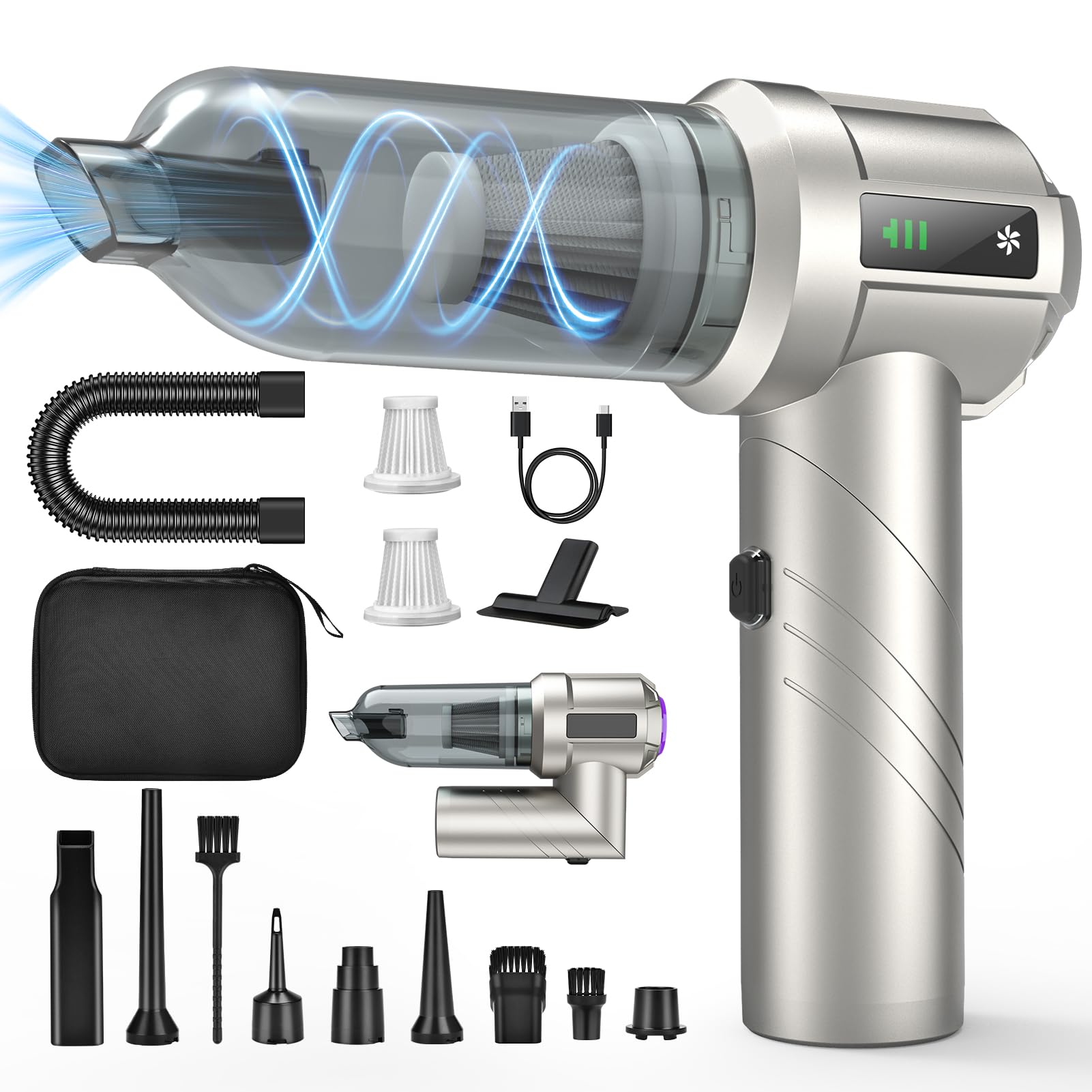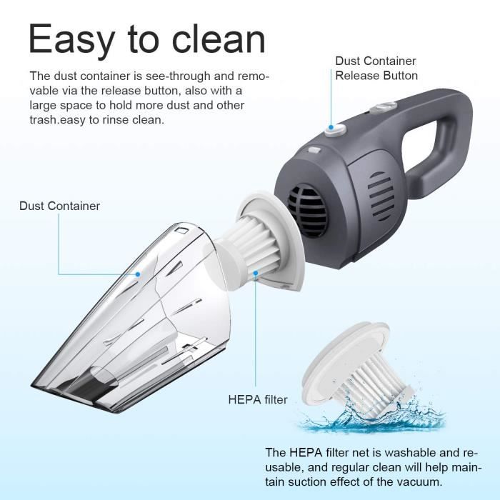 HOTO Aspirateur à Main, 4 en 1 Mini Aspirateur Sans Fil, 20000Pa Aspirateur Voiture Puissant, Souffleur à Air Comprimé électrique pour Voiture, Bureau, Ordinateur, Clavier, Maison et Bureau 【Autonomie généreuse & recharge rapide】Avec sa batterie 8000 mAh, cet aspirateur portable offre jusqu'à 30 minutes d'utilisation. Aspirateur Portable Poils Animaux Aspirateur à Main Sans Fil - 7000PA 120W - Gris - Filtre HEPA Lavable - Electroménager Aspirateur Balai Main 22000pa Idéal pour nettoyer votre voiture, mais aussi pratique en déplacement — gonflez facilement des bouées ou matelas pneumatiques. ILIFE-Robot Aspirateur Sans Fil H75, Moteur BLDC Sans, 47% OFF Aspirateur Voiture Puissant, Aspirateur à Main sans Fil, Aspirateur de Table Rechargeable avec Filtre Lavable pour la Maison, la Voiture, la Table, Le Type Humide et Sec[9000Pa Super aspiration, Design sans fil]Adopté du moteur numérique avancé 120W, cet aspirateur à main a une forte puissance d'aspiration et peut être utilisé en continu pendant 20 minutes. Conception sans fil... 【Portable & facile à utiliser】Avec son design compact et son poids léger de seulement 0,43 kg (18,5 x 6,8 x 18,5 cm), cet aspirateur sans fil est ultra-maniable. 【4 fonctions : souffler, aspirer, gonfler, dépoussiérer】Complet avec plusieurs accessoires pour souffler, aspirer, gonfler et dépoussiérer. Inclus : une trousse de transport en zip résistant (22 x 6 x 16,5 cm) pour le ranger partout. 【Aspirateur mini sans fil 2-en-1】Compact et polyvalent, il combine soufflerie et aspiration. La combinaison brosse + aspiration déloge même les saletés incrustées. Avec trois niveaux d'aspiration (16 000 Pa et 9 000 Pa supplémentaires), il élimine les saletés tenaces dans les recoins les plus étroits de votre véhicule — l'allié parfait pour un intérieur de voiture impeccable !