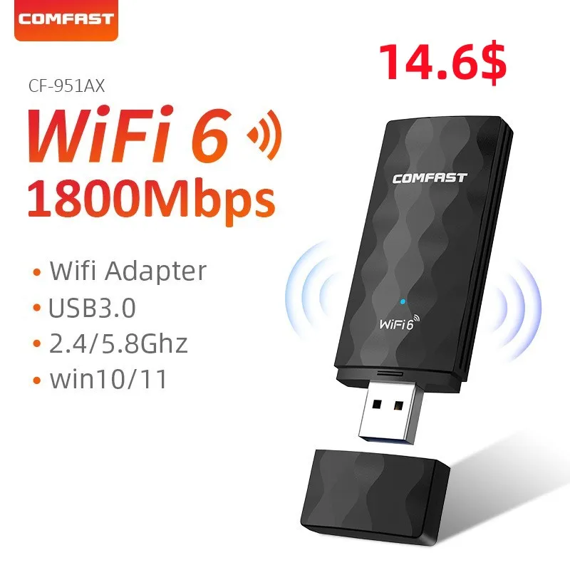 Clé WiFi 6 Adaptateur USB 3.0 Wi-FI Compatible avec Windows 11/10 Tenda AX1800 U18a Grâce à la technologie WiFi6 avancée, l'adaptateur WiFi USB 3.0 prend en charge le protocole IEEE802.11ax et une vitesse maximale allant jusqu'à AX1800... Adaptateur Wifi Pour Windows 10 Et 11 Adaptateur Wifi 6 USB Sans Fil - COMFAST - CF-957AX - 1800Mbps - Double Bande - Gain élevé Adaptateur Sans Fil 1800 Mbps Usb 3.0 Haute vitesse : l'adaptateur USB WLAN admet la technologie WiFi 6 et offre un débit WLAN allant jusqu'à 1800 Mbit/s et, par conséquent, garantit la transmission rapide des données et la reproduction des supports de transmission [Performances optimales] Choisissez la meilleure bande entre 2,4 GHz et 5 GHz pour les exigences de votre réseau., [Fast USB 3., 0] établissez une connexion stable et rapide à l'interface USB 3., 0 et dépassez USB 2., 0., [Compatibilité large] Support pour 802., 11ax, AC, A, B, G, N -Protocols garantit la compatibilité avec plusieurs routeurs et appareils WLAN. [Connectivité parfaite] Atteignez la transmission de données à grande vitesse et la reproduction de supports souples avec un taux sans fil de 1800 Mbit / s.