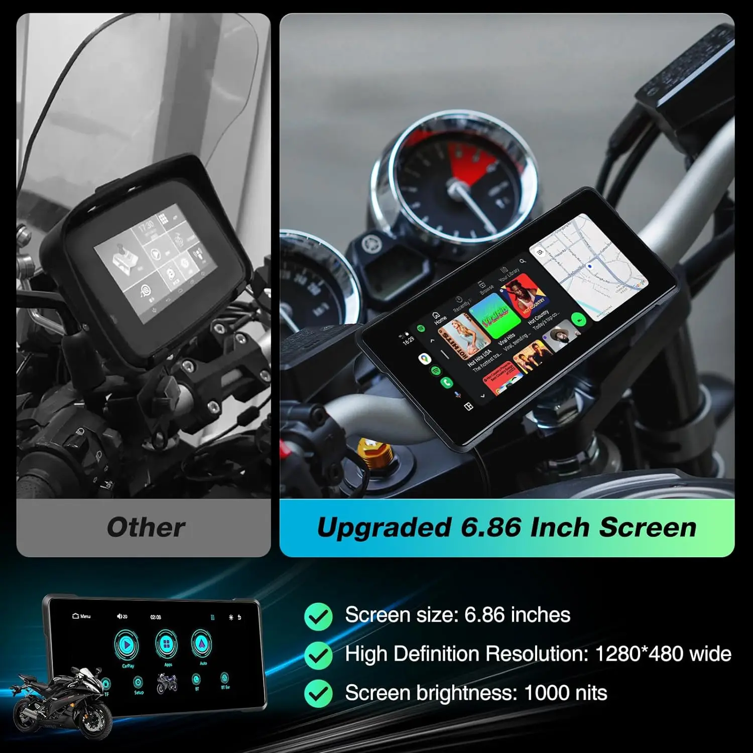 Mise à jour Bluetooth pour Plus de Flexibilité : Cet écran CarPlay de 5 pouces pour moto est équipé de la technologie Bluetooth et se connecte facilement à votre smartphone pour une intégration mobile transparente. CarPlay et Android Auto sans fil pour motos : L'écran moto de 5 pouces se connecte sans fil aux appareils iOS (AirPlay) et Android (Cast). Une fois appairé, vous pouvez accéder à la navigation, aux applications musicales, aux e-mails, aux messages et aux contacts, contrôlés via l'écran tactile ou l'assistant vocal (Siri/Google Assistant Comprend un support réglable pour une visibilité optimale Grâce à la connexion sans fil, vous avez un accès rapide aux fonctionnalités dont vous avez besoin pour une expérience de conduite sûre et confortable. Mini Moto Lecteur De Voiture Sans Fil Et Android Auto écran Tactile HD 9" Bluetooth 5.0, Radio Portable Carplay Moto Sans Fil Idéal pour les longs trajets ou la conduite en ville, il vous permet de rester connecté et de vous divertir en toute sécurité Écran HD Clair de 5 Pouces : Cet navigation pour moto est équipé d'un écran HD de 5 pouces avec une résolution de 854*480 pour des images nettes et lumineuses quelle que soit la luminosité. Vous pouvez également coupler un casque ou un écouteur Bluetooth pour passer des appels et écouter de la musique en mode mains libres. Elle vous avertit des appels et des messages afin que vous puissiez vous concentrer sur la route. Les mises à jour logicielles faciles et les nouvelles fonctionnalités sont prises en charge par les mises à niveau de la carte TF. Vous pouvez également personnaliser l'interface utilisateur en fonction de votre style, que vous souhaitiez une mise en page de navigation simple ou une configuration multimédia détaillée L'appareil prend en charge Siri/Goo-gle Assistant pour une interaction vocale intuitive Test du Carpuride W502B : écran GPS moto 5 pour BMW avec CarPlay et Android Auto Il est facile à voir de jour comme de nuit. Pour plus de sécurité, un système de surveillance de la pression des pneus est disponible en option (accessoire non inclus) pour vous alerter en cas de problèmes de pression VechtelTech - Autoradios et Caméras de Recul Haute Qualité