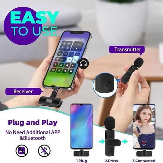 Micro Bluetooth Micro Cravate Sans Fil Pour Iphone Ipad, Plug Play 2,4 Ghz Mini Lapel Micro Pour Smartphone Portée ultra-longue de 20 mètres sans latence, assurant des voix claires et pures. Plug-and-Play sans configuration Aucun Bluetooth/app/pilote nécessaire. S... Micro cravate sans fil - Emetteur / Récepteur - RodeLink Filmmaker, micro rode s S'allume et s'appaire automatiquement. Le micro est omnidirectionnel et capture le son clairement à 360°, avec une puce de réduction de bruit pour éliminer les bruits parasites. Il a même un mode... Streaming garanti sans coupure de courant. Son haute définition et réduction du bruit : Technologie de réduction de bruit intelligente élimine efficacement 95 % des bruits de fond. Portée ultra-longue de 20 mètres sans latence, assurant des voix claires et pures. Compatibilité étendue multi-appareils : Récepteur USB-C + adaptateur iOS/Android, connexion facile aux smartphones, ordinateurs et tablettes, répondant aux besoins de diffusion en direct, réunions et autres scénarios.