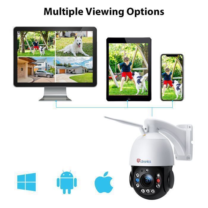 Résolution 2880x1620P pour une image ultra nette, et la vision nocturne en couleur jusqu'à 30m vous permet de tout voir même dans le noir complet. La détection... Camera Exterieur sans fil Solaire Vidéo de marchand (Ne prend pas en charge le suivi automatique) Choisissez la méthode de connexion la plus stable selon vos besoins. 【100 % Sans Fil avec Panneau Solaire 6W】Cette camera exterieur sans fil solaire grâce à son panneau solaire de 6W et sa batterie rechargeable de 7800 mAh. Ctronics Camera Exterieur sans fil Solaire Alimentée par un panneau solaire de 6 W, la caméra WiFi Ctronics ne nécessite aucune alimentation externe et prend en charge. Compatible avec les appareils mobiles et les ordinateurs, la caméra Ctronics vous permet d’y accéder facilement et de partager l’accès avec vos proches. Ctronics Lot De 4 Caméra Surveillance WiFi Extérieur Sans Fil Solaire Ptz Ip Camera 2k 3mp Sur Batterie Vision Nocturne Couleur Pir Detection Humaine Audio Bidirectionnel Ip66 83182720 Aucune alimentation électrique n’est requise. Sirène et projecteurs intégrés. Caméra WiFi Panneau Solaire 6W Ctronics Camera Exterieur Sans Fil Solaire 6 W, 3K 5MP Détection PIR Humaine Vision Nocturne Vue panoramique à 360° 【3K HD et Vision Nocturne Couleur sur 30 m】Cette caméras de surveillance offre des images ultra-détaillées en super HD 3K 5MP (2560×1920P). Équipée de 10 projecteurs LED intégrés, elle offre une vision nocturne en couleur claire jusqu’à 30 mètres. Avec une technologie de vision nocturne avancée, 2 LED infrarouge et 2 projecteurs, il peut voir à travers l'obscurité jusqu'à 25 m dans des conditions de lumière très sombre et vous fournir une vision nocturne en pleine couleur Idéale pour les zones isolées, les jardins ou tout espace extérieur. Qu’il s’agisse d’un visiteur à votre portail ou d’un mouvement suspect à l’arrière de votre maison, vous ne manquerez aucun détail, de jour comme de nuit. Le panneau solaire peut être installé de façon flexible, permettant une recharge simple et rapide, sans besoin d'assistance professionnelle. Vous recevrez des notifications précises et en temps réel sur votre smartphone dès qu’un mouvement humain est détecté. Grâce à ses 10 projecteurs LED intégrés, elle éclaire une zone plus large de votre jardin, permettant une vision nocturne en couleur jusqu’à 30 mètres. 【Stockage Flexible & Installation Facile】La caméra PTZ prend en charge les cartes TF (jusqu'à 128 Go), le stockage cloud ou FTP — vos données, à votre manière.