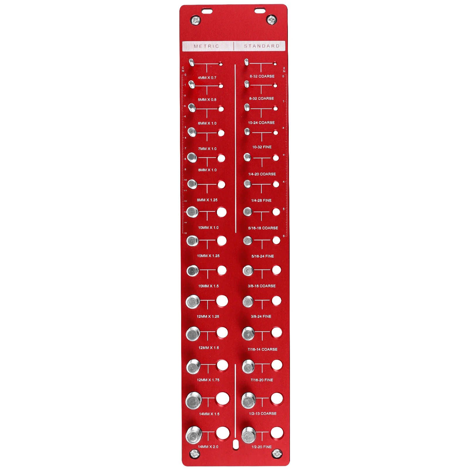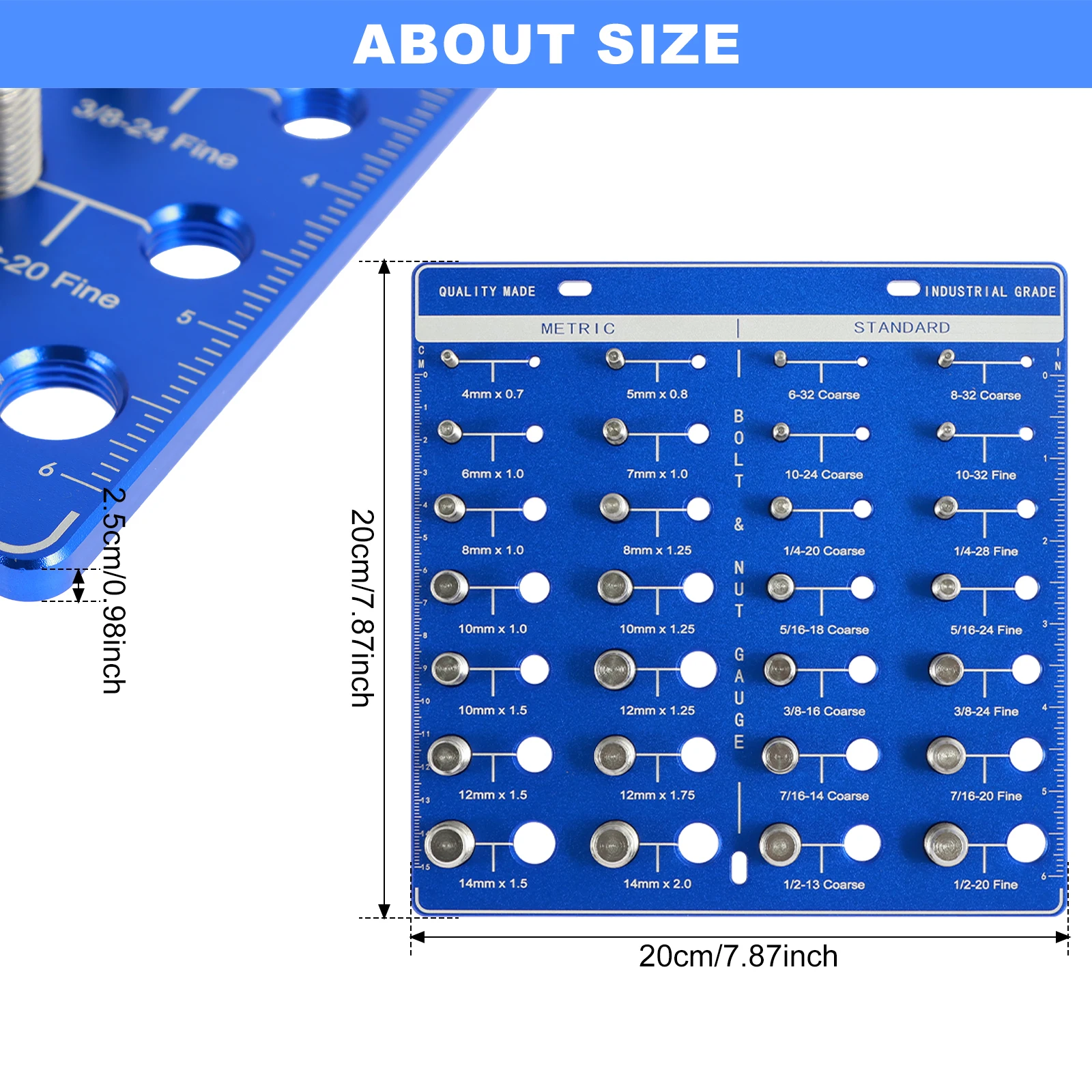 Vérificateur de filetage d'écrous et de boulons (pouces et étriques... 【Précis et rapide】 Cette jauge de tangage de fil vous aide à organiser et à classer rapidement les écrous et les boulons, avec une fonction de reconnaissance de taille bit (3mm-10 mm) pour plus de commodité. 【Application large】 Idéal pour identifier les vis, les écrous et les boulons, cet identifiant d'écrou et de boulons est pour l'entretien quotidien, la fabrication et le professionnel ou l'utilisation. Accessoire Bricolage Mesure Filetage Vérificateur De Filetage D'écrous Et De Boulons (pouces Et Métriques Jauge Filetage 200x200x20mm 【ALLIAGE D'ALUMINUM】 Fait de jauge de fil en alliage en alliage en aluminium de haute qualité, cet outil d'inspection de fil présente une finition durcie pour une résistance à haute résistance, une résistance à l'usure et une précision . Lot de 26 vérificateurs de filetage pour écrous et boulons - 35,6 c et... 【Plusieurs tailles】 Ce vérificateur de filetage de boulons et d'écrou offre 28 tailles de filetage et 8 tailles de pas, avec des gammes de métriques de 0 à 150 mm et de 0 à 6 pouces, garantissant une identification rapide et précise de différentes tailles de filetage. Vérificateur de filetage pour écrous et boulons | Jauges de filetage