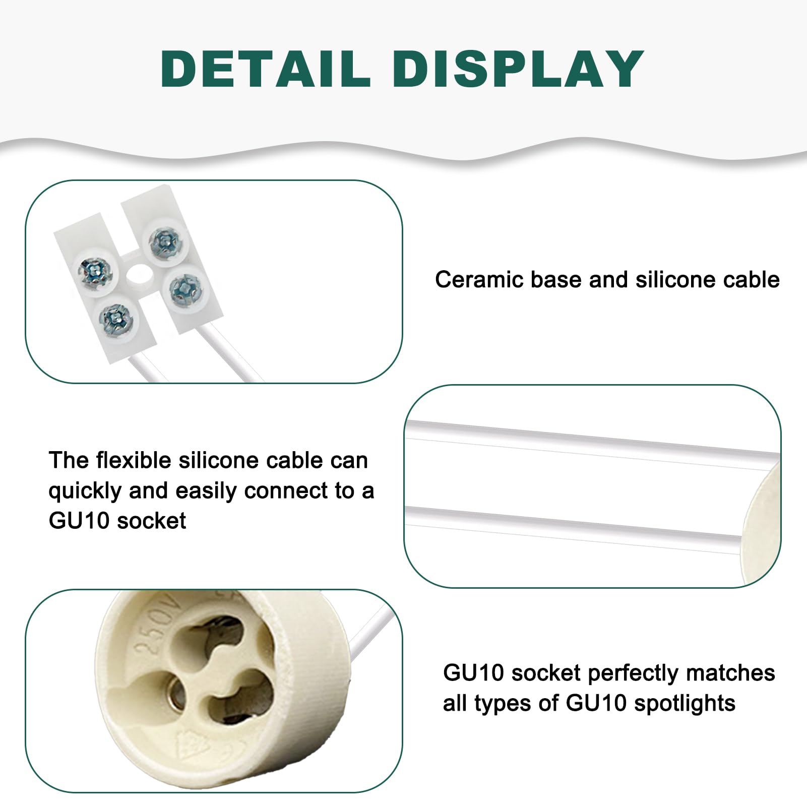 8 pièces douilles en céramique Gu10 avec connecteur de câble 2A 250v... Plage de Tension: Connecteur ampoule gu10 pour une large plage de tension de 0 à 250V et est capable de gérer jusqu'à 200w. Cet ensemble de 8 douilles culot gu10 céramique offre un excellent rapport qualité-prix, permettant de réaliser plusieurs installations ou remplacements à moindre coût, idéal pour les projets d'éclairage à grande échelle ou les besoins de rechange Ensemble Douilles GU10 Installation Douille En Céramique GU10 Avec Fils En Silicone, Fixations De Haute Qualité, éclairage Facile, Installation Résistante, Chaleur, Système De Connexion Sécurisé Pour Projecteurs Installation Facile Bricolage Isolation et Conduction Fiables: Base de douille ampoule avec connecteur rapide résistant à la température de haute qualité et fil de silicone résistant à la chaleur, ces branchement led gu 10 assurent une excellente isolation et une conduction électrique sécurisée, minimisant ainsi les risques de surchauffe et de court-circuit, pour une utilisation en toute tranquillité Lot de 10 Douilles GU10 Céramique Automatique 230V Installation Rapide et Facile: Les fils en silicone flexibles permettent un raccordement simple et douille gu10 avec connecteur rapide, facilitant ainsi l'installation pour les professionnels comme pour les amateurs de bricolage, sans besoin de compétences techniques avancées Douille Pour Lampe Gu10 Douilles GU10 En Céramique Avec Câble Silicone - Lot De 30 - 12 Cm - Pour Ampoules LED Et Halogènes Portalampada Gu10
