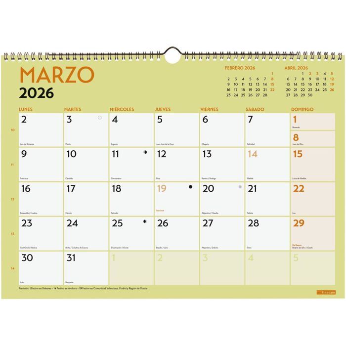 Durée : janvier 2026 - décembre 2026 (12 mois) + sept-déc., 2025 (4 mois) réduit Avec informations sur les jours fériés en Catalogne. Le calendrier dispose également d'autres contenus supplémentaires : calendriers réduits de septembre à décembre de l'année précédente, calendrier annuel de l'année et de l'année suivante, planning annuel, liste des jours fériés des CC AA. Contient des informations utiles et intéressantes, un espace quotidien pour les annotations et le mois précédent et suivant sur chaque page. Chatons - calendrier 2026 - Martin Intérieur : affichage du mois., Planification mensuelle. Thèmes variés et image différente chaque mois, idéal pour décorer le bureau ou la maison. Finocam - Calendrier photo de bureau pour écrire 2025 mois vue janvier 2025 - décembre 2025 (12 mois) Chiens et chats Espagnol Intérieur : Mois Vue... Les articles Finocam sont conçus pour optimiser votre organisation personnelle, vous rendant la vie plus pratique, confortable et plus belle. Parfait pour la planification. AA, jours indiqués, phases lunaires et changements de saison. Calendrier 2026 Finocam - Calendrier De Bureau 2026 Mois Vue Janvier Calendrier Bureau 2026 Vous retrouverez sur cette page plusieurs modèles de mensuel pour l'année 2026 à imprimer. Ces derniers vous permettront d'organiser votre planning mensuel pour chacun des 12 mois du 2026 et des capitales de province et début des nouvelles années chinois, musulman, orthodoxe et hébreu.