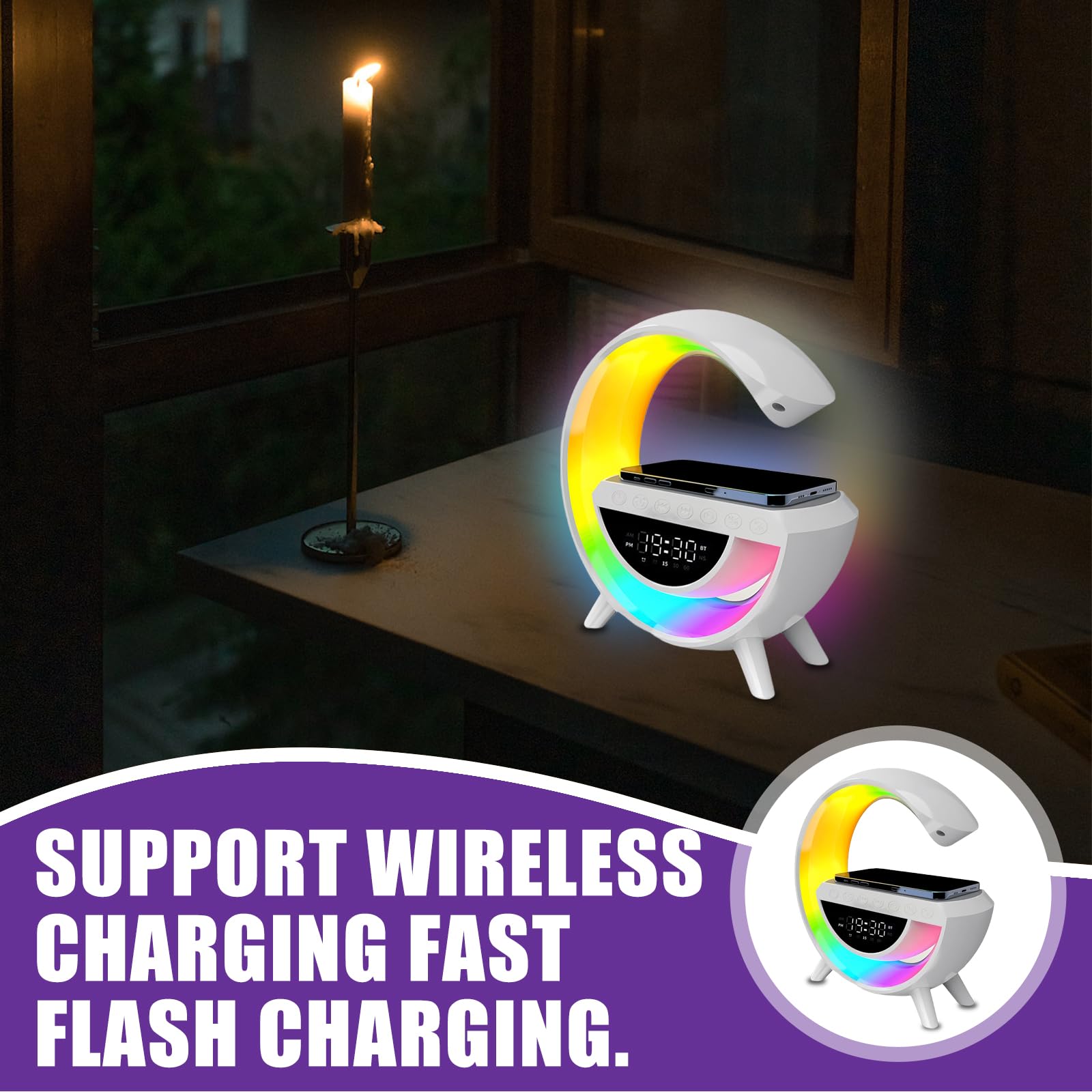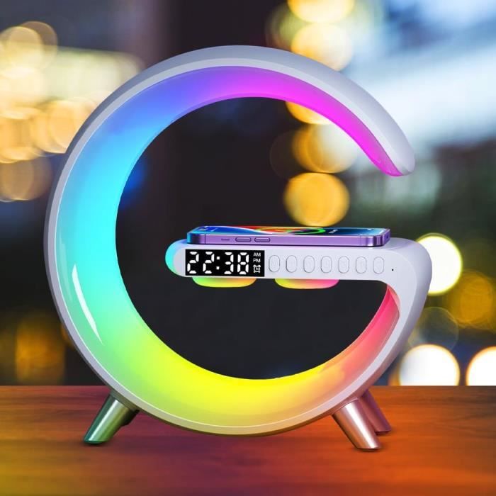 qui peuvent bloquer efficacement les bruits extérieurs. Affichage de l'heure et Fonction Réveil : la lampe de chargement sans fil est équipée d'un écran LED clair qui peut afficher l'heure actuelle, afin que vous puissiez garder une trace des choses à tout moment. Lumières d'ambiance Colorées : cette lampe d'ambiance à chargeur sans fil dispose de 13 types de lumières d'ambiance colorées intégrées, et vous pouvez choisir différents effets d'éclairage en fonction de vos préférences et de vos scènes. Divers Bruits Blancs : le haut-parleur de chargement sans fil LED intègre 7 sons blancs différents, y compris les vagues de la mer, la pluie, le chant des oiseaux, etc. Musique Relaxante Lampe De Chevet Chargeur Sans Fil, Tactile Avec La lampe de bureau avec chargeur sans fil vous aide à vous détendre et à améliorer la qualité du sommeil (Batterie 1200mAh intégrée) Affichage de l'heure et Fonction Réveil : la lampe de chargement sans fil est équipée d'un écran LED clair qui peut afficher l'heure actuelle, afin que vous... La couleur de la lumière change lorsque la musique est jouée. Pour charger, placez simplement votre téléphone portable sur l'extrémité gauche du panneau de la lampe de chevet à intensité tactile. Dans le même temps, la lampe de chargement sans fil dispose également d'une fonction réveil et les réveils peuvent être réglés pour que vous vous réveilliez à l'heure chaque matin. Veilleuse Couleur Ambiance Lampe De Chevet LED Avec Fonction De Charge - Réveil Intelligent Lampe Chevet LED Lampe de table réglable]Cette lampe de chevet à intensité variable propose 3 modes d'éclairage (6000 K/4500 K/3000 K) et plusieurs niveaux de luminosité (10 % à 100 %). Cette lampe à charge par induction utilise des LED de haute qualité pour diffuser une lumière douce et homogène Lampe de chevet à intensité variable, elle prend également en charge la lecture du disque U et de la carte TF/entrée audio AUX.