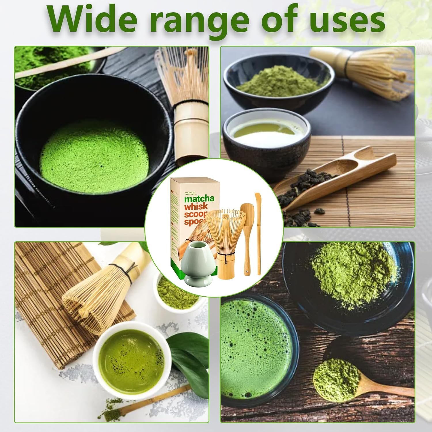 Meilleur Kit à Matcha Bruciagrassi Dimagrante Potente Set Matcha Japonais 5 Pièces - Bol, Fouet, Cuillère, Tamis - Cadeau Idéal Pour Amateurs De Thé Set Matcha Traditionnel Fouet Matcha Découvrez le coffret matcha parfait pour chaque amateur de thé Cet ensemble matcha de 5 pièces offre tout ce dont vous avez besoin pour une expérience matcha authentique. Avec un ensemble d'accessoires de haute qualité soigneusement sélectionnés, vous pouvez facilement profiter des effets bénéfiques du thé matcha. Que vous soyez un amateur de matcha chevronné ou que vous commenciez... Set Matcha Japonais Set Matcha Traditionnel Japonais 5 Pièces - Bol, Fouet, Cuillère, Tamis & Support - Cadeau Élégant Fouet Chasen Bol Chawan 【Conception humanisée】L'intérieur du bol à matcha est lisse et possède un diamètre plus large, ce qui facilite le nettoyage ; le support à balai spécial aide à préserver la forme du balai à matcha et à prolonger sa durée de vie ; de plus, le bol dispose d'un design unique de bec verseur qui empêche le thé de se renverser sur la table ou les mains Il comprend tout le nécessaire pour préparer ton matcha comme au Japon : un bol (chawan), un fouet en bambou (chasen), une cuillère (chashaku), un tamis et un... 【Largement répandu】Cet coffret matcha peut être utilisé pour préparer des latte matcha, du lait matcha et de nombreuses autres boissons, et il convient également à d'autres aliments comme la glace et les gâteaux., Il est polyvalent 【Esthétique】La couleur de l'ensemble de matcha kit verte, ce qui est très harmonieux avec le matcha ; le motif en forme de fromage stimule l'imagination et crée une atmosphère spéciale pour la préparation du matcha Le bambou a été traité avec de l'huile végétale, ce qui le rend moins susceptible de moisir ou de se fissurer. Matcha Kit 5 Pièces, Set Matcha élégant en Vert, Coffret Matcha pour Les Amateurs de Matcha, Accessoires de Matcha Avec Support pour Fouet, Tamis, Cuillère et Bol