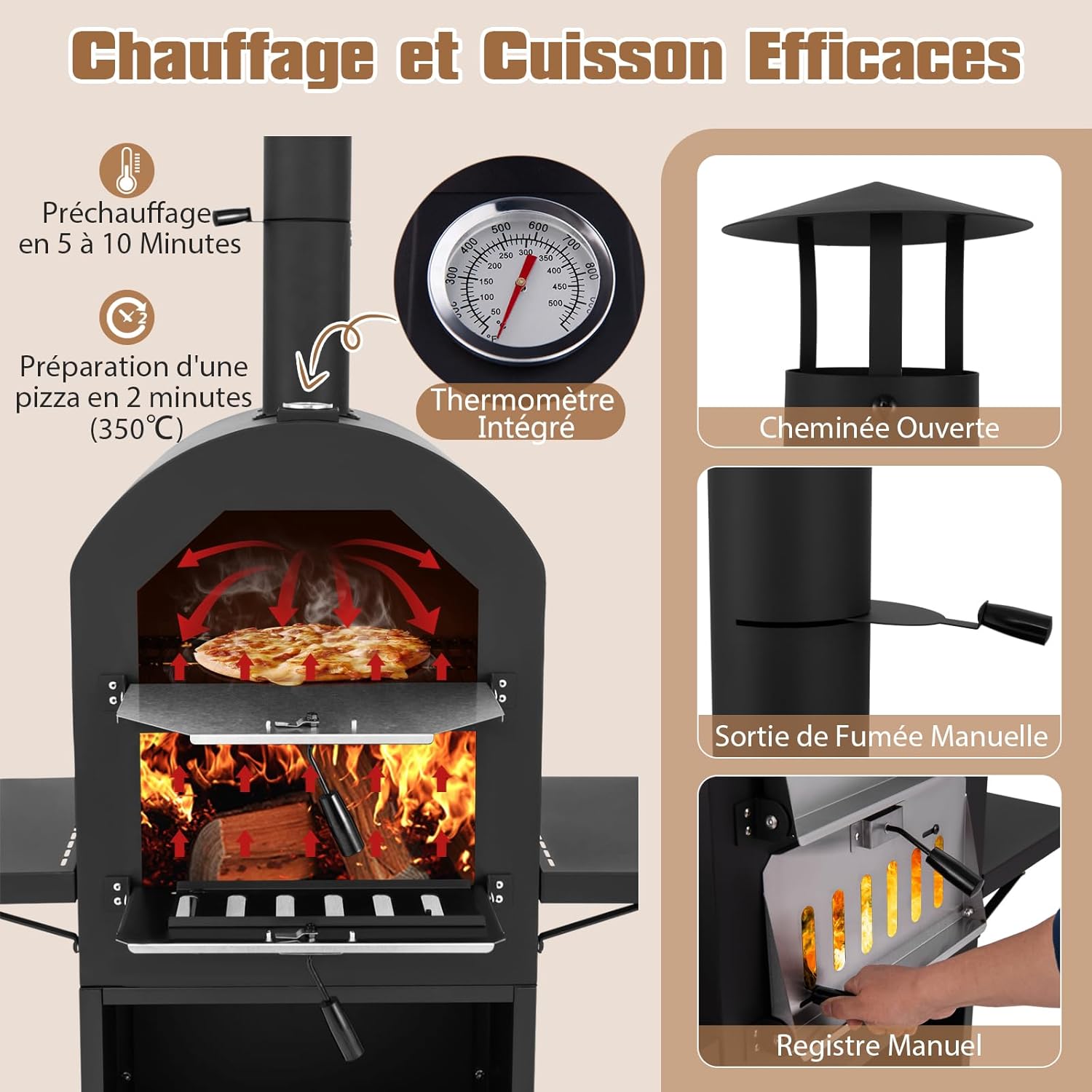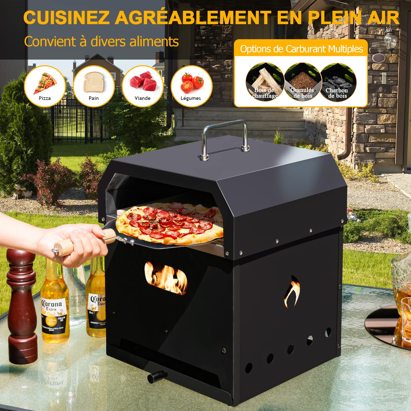 Four A Pizza Gymax Avis Four à Pizza Extérieur à Bois, Pierre à Pizza Rotative De 30cm, Pelle à Four Extérieur Pour Jardin Barbecue GIANTEX Four à Pizza Extérieur en Inox à Bois/Charbon/Granulés avec GYAX Four à Pizza Extérieur 162C, Four à Pizza à Bois ou à Pellet... # 𝐂𝐮𝐢𝐬𝐬𝐨𝐧 𝐄𝐟𝐟𝐢𝐜𝐚𝐜𝐞𝐬 & 𝐂𝐨𝐧𝐭𝐫ô𝐥𝐞 𝐝𝐞 𝐓𝐞𝐦𝐩é𝐫𝐚𝐭𝐮𝐫𝐞 # Ce four à pizza peut être préchauffé à 350 °C en 5 à 10 minutes, puis cuire une pizza en seulement 2 minutes. # 𝐂𝐨𝐧𝐬𝐭𝐫𝐮𝐜𝐭𝐢𝐨𝐧 𝐌é𝐭𝐚𝐥𝐥𝐢𝐪𝐮𝐞 & 𝐃é𝐩𝐥𝐚𝐜𝐞𝐦𝐞𝐧𝐭 𝐅𝐚𝐜𝐢𝐥𝐞 # Ce four à pizza au bois est doté d'un boîtier en acier inoxydable pour résister à d'innombrables aventures culinaires en plein air. Ses 4 roues universelles vous permettent de le déplacer où vous le souhaitez, dont deux sont verrouillables pour garantir la stabilité du four à pizza. Traits Dominants Grand espace de cuisson adapté à différents aliments Grand compartiment inférieur pour le stockage du combustible Deux étagères latérales peuvent accueillir des ustensiles de cuisine Fabriqué en acier inoxydable et métal thermolaqué pour une utilisation longue durée Régulateur manuel pour un contrôle facile de la puissance du feu et de la fumée Cheminée ouverte avec évacuation manuelle des fumées pour un contrôle optimal Cendrier arrière pratique pour le nettoyage des cendres Thermomètre intégré pour un contrôle permanent de la température interne 4 roulettes universelles pour un déplacement facile et deux roulettes avec frein pour une meilleure stabilité Housse de protection incluse pour protéger de la poussière et de l'eau Infos Détaillées Couleur : Noir Matériaux : Métal, acier inoxydable, tissu Oxford Dimensions du produit : 116 x 44 x 170 cm (L x l x H) Dimensions du compartiment de rangement : 44 x 37 x 40 cm (L x l x H) Dimensions de la porte supérieure : 38 x 23 cm (L x l) Dimensions de la porte inférieure : 38 x 20 cm (L x l) Dimensions de chaque étagère latérale : 37 x 33 cm (L x l) Dimensions de la pierre à pizza : 30,5 x 30,5 cm (L x l) Dimensions de la pelle à pizza : 72 x 31 cm (L x l) Dimensions de chaque grille de cuisson : 34,5 x 24 cm (L x l) Dimensions de chaque grille à charbon : 34,5 x 24 cm (L x l) Hauteur de la cheminée : 46 cm Poids net : 29 kg Le Colis Comprend 1 x Four à pizza 1 x Pierre à pizza 1 x Pelle à pizza 2 x Grilles de cuisson 2 x Grilles à charbon 1 x Housse de protection 1 x Mode d'emploi # 𝐃é𝐭𝐚𝐢𝐥𝐬 𝐁𝐢𝐞𝐧 𝐏𝐞𝐧𝐬é𝐬 # Le compartiment inférieur ouvert du four permet de ranger le bois de chauffage, tandis que les 2 étagères latérales permettent de garder les ustensiles de cuisine à portée de main. Vous pouvez régler la sortie de fumée et le régulateur pour contrôler la puissance du feu et le débit de fumée. # 𝐈𝐝é𝐚𝐥 𝐩𝐨𝐮𝐫 𝐀𝐜𝐭𝐢𝐯𝐢𝐭é𝐬 𝐝𝐞 𝐏𝐥𝐞𝐢𝐧 𝐀𝐢𝐫 # Ce four à pizza d'extérieur dispose d'une pierre en cordiérite pour la cuisson de pizzas, de poulets rôtis, de barbecues et de tartes pendant des réunions dans le jardin ou le pique-nique. Découvrez la nouvelle gamme de fours à pizza Ooni ! Une qualité de cuisson digne d'un restaurant traditionnel directement chez vous! Commandez...