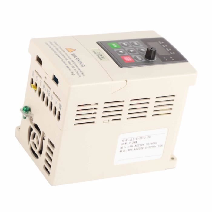 pour toute question concernant les lignes d'assemblage, les machines d'emballage et la manutention, n'hésitez pas à nous contacter. Automation Industrielle Variateur Variateur De Fréquence Convertisseur De Fréquence Variable Monophasé 1 Convertisseur 220V 0.75kW Moteur Caractéristiques:Matériau : plastique ABS ignifugeFonction : livré avec la fonction de communication RS485Couleur : blancTension d'entrée nominale : monophasé 220 VTension de sortie nominale : triphasé 220 VPuissance nominale : 0,75 kWCourant de sortie : 5 AFréquence d'usine : 50 HzFréquence de sortie : 0-999 HzMéthode d'installation : montage mural, montage sur armoireTaille : 23*17*16cmNature de l'alimentation CC : type de tensionMode de contrôle : boucle fermée V/FMéthode de régulation de la tension de sortie : contrôle PAMDomaine d'application : chaîne de montage, bande transporteuse, etc. Jadeshay Variateur de Vitesse pour oteur 220VAC 2.2KW Variateur de... 【Protection intelligente complète】: Protection automatique contre les surintensités, la surchauffe, les courts-circuits et les fluctuations de tension (plage de 160 à 280V). Communication RS485 pour une surveillance en temps réel. PAL Variateur de fréquence monophasé à triphasé 2.2KW Mini... Le contrôle PAM et la technologie en boucle fermée V/F optimisent la consommation d'énergie, réduisant la production de chaleur de 30% par rapport aux modèles standard. La dissipation thermique améliorée grâce au radiateur intégré empêche la surchauffe, tandis que les modules IPM/IGBT fournissent une puissance de sortie stable de 0,75kW (220V monophasé/triphasé). 【Contrôle de précision pour applications exigeantes】: Sortie réglable de 0 à 999Hz avec une précision de couple élevée (±2%), même à faible vitesse. Monophasé à triphasé VFD Variateur de fréquence universel VFD monophasé 【Fonctionnement ultra-silencieux et efficacité intelligente】: Conçu avec un matériel et un logiciel avancés d'atténuation du bruit, cet onduleur fonctionne à des niveaux de silence absolus, idéal pour les ateliers nécessitant un minimum de perturbations sonores. Montage mural ou en armoire, son format compact (23x17x16cm) s'adapte aux espaces restreints.