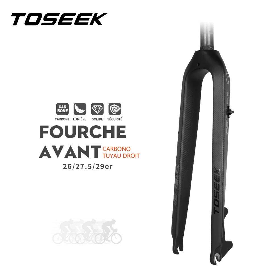 TOSEEK – fourche avant de vélo tout en Fiber de carbone, 26/27, 5/29 pouces, Tube droit rigide, 560g, légère Axe traversant BOOST 15 x 110 mm. Fourche Remplacement VTT STRTG Fourche Rigide De Vélo Fourche Avant De Vélo Entièrement En Carbone 3K Frein À Disque Fourche Dure Fourche De Vélo VTT Accessoires De Vélo Droit 26/27,5/29 "Pouces A,29inch Fourche Rigide Carbone VTT 27.5 29 Pouces TAILLE DE LA FOURCHE RIGIDE : 28,6 x 39,8 x 280 mm (tube conique 1-1/2''), longueur du tube de direction 280 mm, frein à disque, déport : 45 mm. Fourche VTT solo air pour frein à disque pivot conique lisse 11-8-28,6... Zerone Adaptateur de fourche à axe traversant pour arbre de fourche... Décalage de 45 mm, adoption de supports de frein à disque à montant A for une meilleure stabilité de freinage ! max for pneus 3,0''. BOOST THRU AXLE : Axe traversant 15X110mm conception simple, facile à installer et à utiliser, pratique à utiliser. Fourche rigide Informations :Matériau : Fibre de carbone complèteFinition : Noir mat, Noir brillantTaille du tube de direction : 1-1/2 (tube de direction conique 39,8 x 280 mm)Diamètre du tube de direction : 28,6 mmLongueur de direction : 280 mmDécalage : 45 mmFrein adapté : Frein à disque 74 mmAxe traversant BOOST : 15 x 110 mmPour taille de pneu : 27., 5ER/29ERType de vélo : for VTTPoids : environ 694 g ± 30 gEmballer:Fourche de vélo rigide x1Veuillez noter:1., Veuillez vérifier attentivement les détails de notre liste en fonction de l'état réel de votre vélo for vous assurer d'acheter la fourche de vélo adaptée., 2., En raison des spécifications de taille for la mesure manuelle, veuillez donc prévoir une légère erreur, l'éclairage sur la photographie peut entraîner des différences de couleur par rapport à la réalité., 3., Si vous avez des questions, veuillez nous contacter, nous le résoudrons for vous dans les 24 heures. Les lames en fibre de carbone aident à minimiser les vibrations et le poids, tout en offrant une rigidité essentielle. Fourche rigide for VTT 27,5/29 pouces en fibre de carbone, axe traversant Boost 15 x 110 mm, freins à disque, tube conique 1-1/2, fourche avant T800 ultra légère.