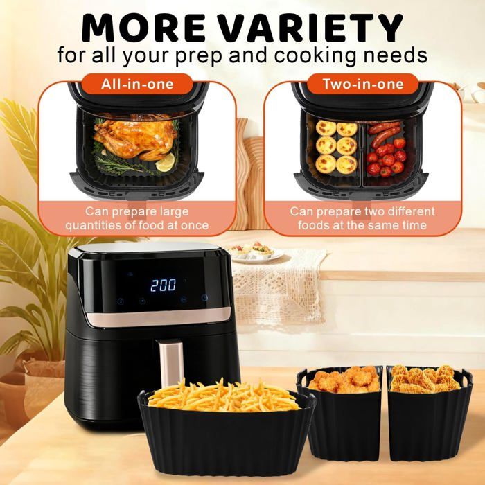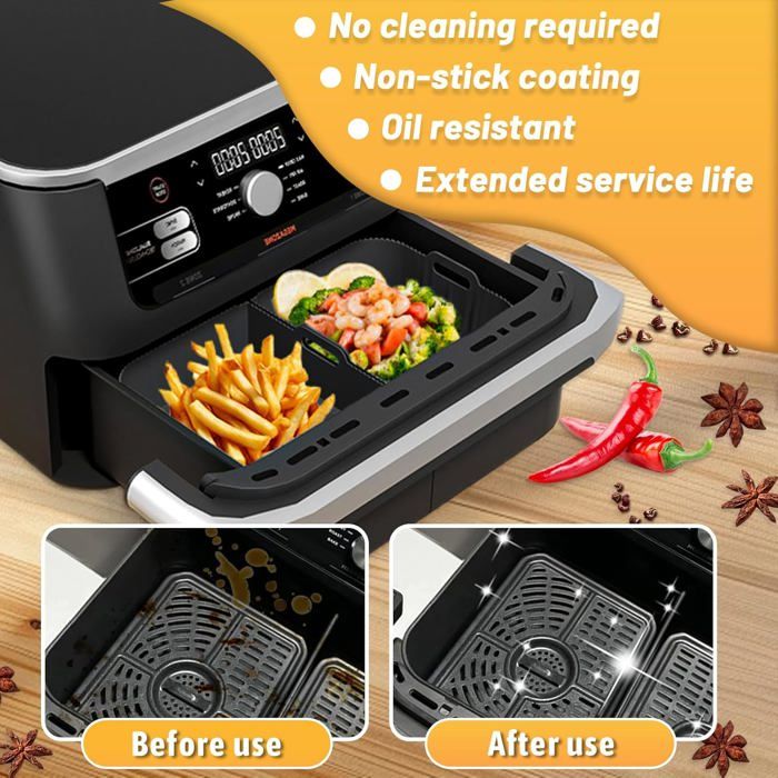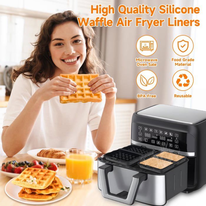 Accessoires Friteuse Air Kit 19 Accessoires Air Fryer Ninja 7.6-9.5L - Moules Silicone, Supports Pour Friteuse Air Plat Air Fryer spécifications: couleur:Noir Matériel:Silicone Taille de l'emballage:24*16*10cm contenu de l'emballage: 1 revêtement en silicone pour friteuse à air chaud (10,4 litres), 1 pince de qualité alimentaire, gants résistants à la chaleur. Plat Air Fryer Ninja 10 Pcs Accessoires Pour Friteuses à Air, Accessoires Pour Friteuse à Air Coprié Pour Foodi Antiadhésif Résiste 230°C Il remplace le papier sulfurisé jetable pour friteuse à air chaud. NINJA Foodi FlexDrawer Air Fryer, Dual Zone Avec Séparateur Aovible, Grand Tiroir de 10.4 L, 7... Moule Silicone Air Fryer Accessoires pour friteuse à air chaud Ninja AF500EU AF400EU, sans BPA | Accessoire pour friteuse à air chaud à double zone... Il s'installe facilement et solidement pour garantir des résultats de cuisson constants à chaque fois. Conception pratique : la doublure en silicone pour friteuse à air chaud présente une conception innovante avec des rainures spécialisées pour assurer une circulation optimale de l'air et une répartition uniforme de la chaleur. Facile à nettoyer : le revêtement en silicone pour friteuse à air chaud passe au lave-vaisselle, ce qui réduit le nettoyage après la cuisson. Doté d'un revêtement antiadhésif, il est non toxique, imperméable, résistant à l'huile et très résistant à la chaleur, supportant des températures allant jusqu'à 230 °C. Utilisation polyvalente : notre revêtement en silicone s'adapte aux modèles Philips AF500EU et AF500EUCP. fonction: cette doublure en silicone pour friteuse à air chaud est fabriquée à partir de silicone de qualité alimentaire supérieure.