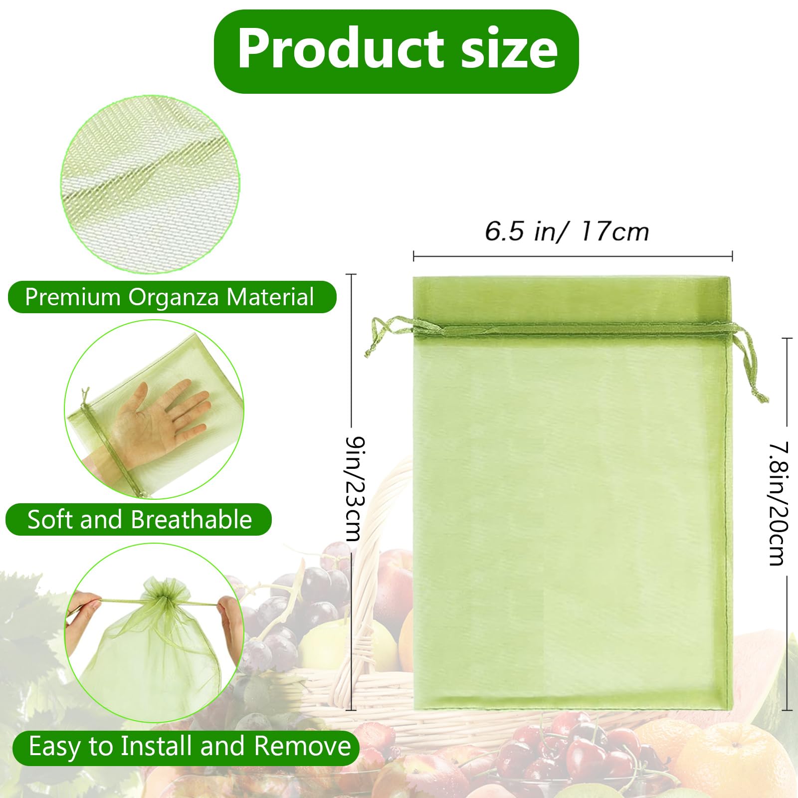 Sachet Protection Raisin 100 Pièces,20 x 30 cm Sac Protection Fruits Matériau de haute qualité: Les sacs à fruits sont fabriqués en organza de haute densité, solide et durable, et peuvent être réutilisés. Sacs Raisin 17x23cm Cordon Sac De Protection Pour Fruits Sac De Protection Des Fruits Réutilisables - SURENHAP - Lot De 100 Sacs Sac Protection Raisin Protection Oiseau La bonne taille offre suffisamment d'espace pour les fruits qui ont besoin de protection et peut accueillir des fruits ou des vignes plus gros Sacs De Protection des Fruits, 100 Pièces Sac Protection Raisin avec... Maison - Découvrez notre offre 100 Pièces 17x23cm Sac Protection Fruits, Sachet Protection Raisin, Sachets en Respirant avec Cordon de Serrage, Sac en Organza Le cordon de serrage peut être fixé à une branche, de sorte que le sac de protection ne peut pas être facilement emporté par le vent et la pluie Idéal pour les raisins, fraises, tomates cerises et autres petits fruits Largement utilisé: Les jardin plant fruits protection sac peuvent être utilisés pour protéger les raisins, les fraises, les pommes, les cerises et autres fruits, ainsi que les tomates, les concombres, les plantes, les légumes, les fleurs, etc Sac protection fruits de raisin raisonnables: 100 grands sachet protection raisin, taille : 17 x 23 cm. Design pratique: Conception à cordon de serrage, peut être rapidement scellé avec une traction douce, facile à utiliser. Caractéristiques: 1., Les sacs de protection des fruits sont scellés avec une ficelle en nylon, qui est très facile à utiliser car elle peut être scellée rapidement en tirant doucement., 2., Les sacs à fruits sont disponibles dans une couleur verte qui se marie bien avec votre jardin, lui donnant un aspect naturel., 3., Ces sacs à fruits pour le jardin peuvent être utilisés tout au long de l'année et sont adaptés pour une utilisation dans toutes les conditions météorologiques.