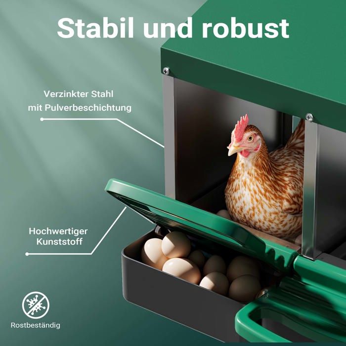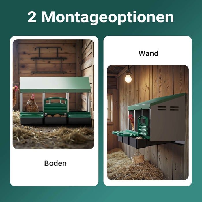 Pondoir 3 Emplacements En Bois Avec Fond Et Toit Gris Blanc En plus de faciliter la ponte, cet équipement simplifie aussi la récupération de vos œufs. Gagnez du temps et arrêtez de chercher les œufs pondus par vos poules au fond de votre poulailler ou dans tous les recoins de votre enclos ou parc à poule : tous les œufs sont regroupés au même endroit Pondoir Poule Extérieur Fudajo Pondoir Pour Poule 81 X 52 X 48 Cm 3x Bac De Récupération Ponte Pondoir Avec Bac Récupération Description du produit Présentations : Offrez confort et sécurité à vos volailles grâce à notre pondoir à 3 compartiments, conçu pour satisfaire l'instinct naturel de couvaison des poules, canards et autres volailles. 【Conception adaptée aux poules】Conçu avec soin pour offrir un environnement sûr et privé à vos poules, reproduisant leur environnement naturel de ponte, pour une ponte facile et sans stress. LEADZ Pondoir Poules pondeuses 1 eplaceents - Poulailler en étal... Sa conception adaptée aux poules et ses protections facilitent la collecte des œufs tout en assurant le confort de vos poules., Spécifications : 1., Dimensions hors tout : 54 x 52 x 47 cm (L x l x H) 2., Dimensions du couvercle : 55 x 34,5 cm (L x l) 3., Dimensions du compartiment : 33 x 27 cm (L x l) 4., Dimensions du plateau inférieur : 33 x 25,5 cm (L x l) 5., Matériaux : acier, plastique 6., Poids net : 5,5 kg Contenu : 1 nichoir à poules à 2 compartiments Mode d'emploi Facile à installer et prêt à l'emploi 【Construction durable】Fabriqué en acier et en plastique, ce nichoir est résistant aux intempéries et durable, garantissant une longue durée de vie à votre élevage. 【Protection des œufs】Le fond en plastique légèrement incliné et bien ventilé maintient les œufs en sécurité dans le poulailler, facilitant leur ramassage et les empêchant de rouler. 【Ponte optimisée】Une protection frontale protège la litière et prévient les déversements.