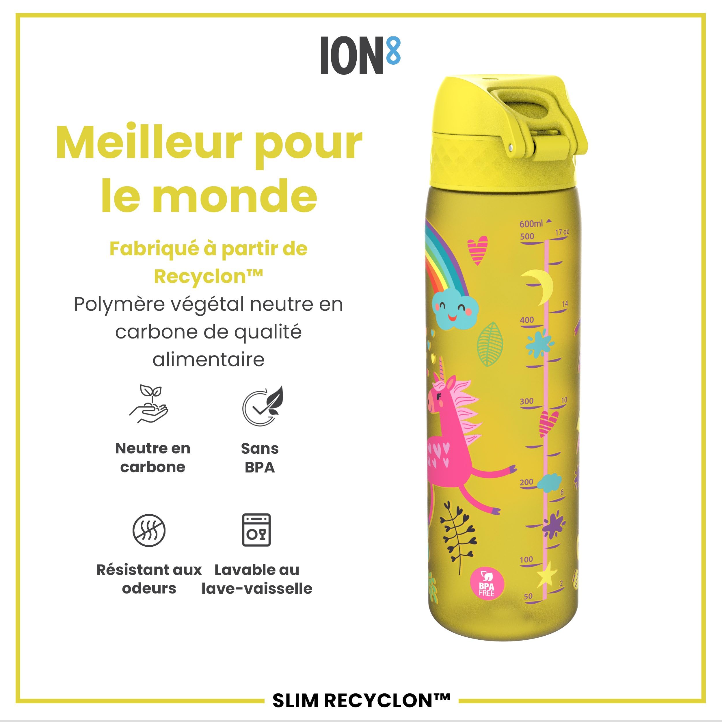 Après, lavez à l'eau tiède avec du savon ou au lave-vaisselle (panier supérieur, lavage à froid). Gourde Ion8 500ml Licorne Isolante Sans Bpa Lave Vaisselle Gourde Transport Facile Bec Gourde ION8 Licorne 500ml - Anti-Fuite - Sans BPA - Lavable Lave-vaisselle - Poignée Transport - Enfants Bouteille Eau Licorne Gourde Sport école Sans BPA Cette bouteille neutre en carbone réduit les déchets et conserve la fraîcheur. Assurez-vous que les joints sont en place. L’alternative idéale au thermos pour l’école, le sport ou les trajets. SÛRE & SANS ODEUR – Compatible lave-vaisselle, anti-odeur et hygiénique avec son couvercle flip. Ion8 Gourde Enfant Inox 400ml, Anti-Fuite, Facile à Ouvrir Vérifiez que tous les joints sont en place, car une fuite peut se produire sans eux. Séchez à l'air libre et rangez sans le bouchon. Comment nettoyer mon ION8 ? Rincez la bouteille et le bouchon à l'eau froide avant utilisation. ION8 OneTouch Vidéo de marchand Parfaite pour tous, où que vous alliez. ÉCOLOGIQUE & SANS BPA – Fabriquée en Recyclon, plastique végétal et neutre en carbone, cette gourde sans BPA est réutilisable, sûre et parfaite pour les familles éco-responsables Gourde, 500Ml, Anti-Fuite, Facile À Ouvrir, Verrouillage Sécurisé... Pouvez-vous me donner des conseils sur l’utilisation de ma bouteille ION8 OneTouch ? Inclinez légèrement la bouteille pour un écoulement optimal. Combien d'eau ai-je besoin pour être bien hydraté ? L'UE recommande 2 à 2,5 litres de liquides par jour, y compris l'eau des aliments. Comment entretenir ma bouteille ION8 ? Évitez les brosses, l'abrasif, la congélation pleine, l'ébullition, le micro-ondes, les boissons gazeuses et les lavages très chauds au lave-vaisselle. Quel type d'acier utilisez-vous ? Cette bouteille gardera-t-elle mes boissons au frais? Nous utilisons uniquement l'acier inoxydable 304 (18/8), idéal pour un usage alimentaire, résistant à la corrosion et facile à désinfecter.