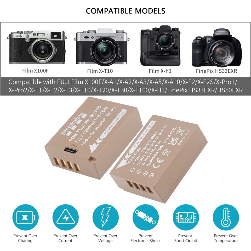 ENEGON NP-W126S / W126 Batterie De Rechange (2 Paquets) Et Chargeur Double Intelligent LED USB Pour Fujifilm X100F X100V X100VI X-T3, X-T2, X-T1, X-Pro2... Il peut deux batteries simultanément ou une batterie avec n'importe quelle source d'alimentation USB. Compact et portable: la conception mince et légère des batteries de rechange économise de l'espace et offre une commodité pour vos voyages, vos voyages d'affaires et vos activités de plein air. Pack Batteries X100v X-t30 Batterie (Paquet De 2) Et Double Chargeur USB Pour Fujifilm X100V, X100F, X- A5, X-A10, X-E4, X-Pro2, X-Pro3, X-T1, X-T2, X-T3, X-T10, X-T20, X-T30, X-T30 II, X-T100, X-T200 Batterie Fujifilm X100V Plusieurs options de : le double chargeur USB LCD avec ports USB et Type C vous permet d'alimenter vos batteries avec n'importe quel câble USB 5 V, tel qu'un PC, un chargeur de voiture ou une banque d'alimentation, offrant une flexibilité de chargement. ENEGON NP-W126S / W126 Batterie de Rechange (2 Paquets) et Chargeur... Liste des paquets :2 x batterie d'appareil photo1 x chargeur1 x câble de chargement1 x chiffon de nettoyage Fujifilm X-t30 Mspalocell 3 Piu00e8ces NP W126 Batterie USB C 1600mAh Batterie NP W126S Type C, Pour Fuji X T100,X T200,X100F,X100V,X S10,X A5,X A10,X E3,X E4,X Pro2,X Pro3,X T1,X T2,X T3,X T10,X