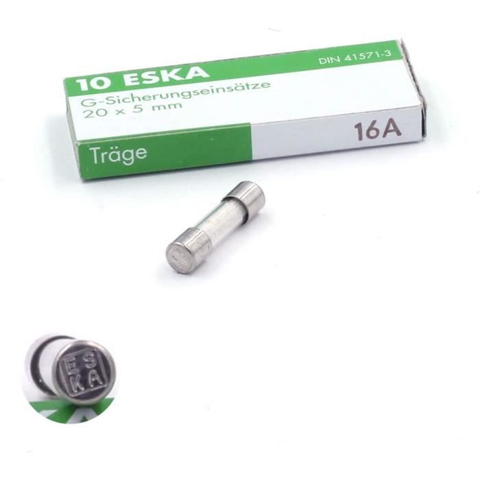 520.027 ESKA - Fusible: de cartucho rápido; 10A; 250VAC; cilíndrico,de cristal Fusible Temporisé (T) céramique 5A/250VAC 5x20mm Fusible 5a 250v Céramique Fusible De Retardo De Tiempo Cerámico 10x (T) 10A / 250VAC 5x20mm Fusible 5A 250VAC 5x20mm Principaux points forts · Adaptateur de courant CA. 5 A · Marque. ESKA · Tension. 250 Volts · Matériau. Céramique · UPC. 744022602711 · Note actuelle. 5 A Lot de 10 fusibles temporisés (type T) 200mA/250V, format standard 5x20mm. Parfaits pour les appareils électroniques qui nécessitent un démarrage progressif...