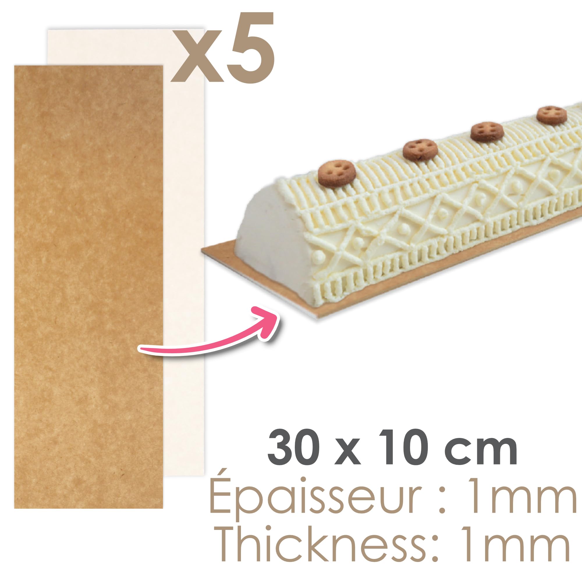 👩🍳 VARIÉTÉ DE PLATEAUX ET EMBALLAGES POUR PÂTISSERIE ⇢ Nous proposons des plateaux pour gâteaux ronds, carrés et rectangulaires, disponibles en or, or-noir, argent et or-argent. Plateau Gateau 6 Supports à Bûches & Cakes 30x10cm - Carton Rigide Adesivo Empurre 30x10 cm - Placas de Sinalização 🎂 PLATEAU RECTANGULAIRE POUR GÂTEAUX ET PÂTISSERIE ⇢ Idéal pour présenter des gâteaux à plusieurs étages, entremets ou desserts réalisés dans des moules rectangulaires. ✨ DOUBLE FACE AVEC EFFET BRILLANT ⇢ Notre plateau pour gâteaux possède deux faces lisses avec effet brillant, vous permettant de choisir le côté qui s’harmonise le mieux avec vos desserts. Réversible Noir Doré Lot De 50 Supports à Gâteaux Ronds - Carton Réversible Doré Moule A Buche Protège le goût de vos créations en évitant le contact direct avec la boîte et apporte une finition professionnelle à votre pâtisserie. 📏 DIMENSIONS ET POLYVALENCE ⇢ Avec ses dimensions 30 x 20 x 0,1 cm (épaisseur de 1 mm), ce plateau rectangulaire est parfait pour des gâteaux d’anniversaire, desserts en forme de chiffre ou de lettre, bûches de Noël, muffins, cupcakes, biscuits 🍪 ou gâteaux à thème. Produit recyclé et recyclable. ♻️ FABRIQUÉ EN EUROPE ET RESPECTUEUX DE L'ENVIRONNEMENT ⇢ De la fabrication du matériau à l’emballage et l’étiquetage, tout est réalisé en Europe.