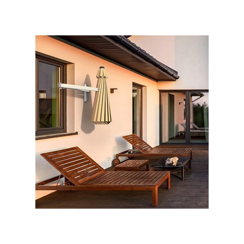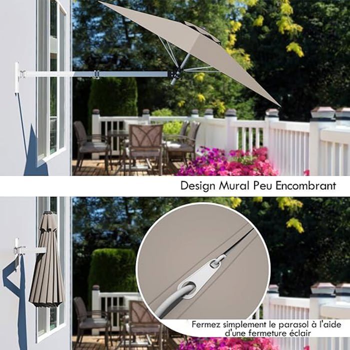 xL) Poids net : 7,5 kg Livraison : 1 x Parasol mural 1 x Manuel d'instruction GOPLUS 247CM Parasol Cantilever Mural, Parasol de Jardin Extérieur avec Tête Inclinable & Support Réglable, 8 Baleines Robustes & Aération, pour Balcon... ☀️Facile à Installer et à Ranger : En suivant les instructions détaillées et les accessoires nécessaires fournis, ce parasol de terrasse peut être facilement installé sur un mur sans support de parasol. Caractéristiques : Tissu en polyester imperméable et résistant au soleil qui dure longtemps Aération sur le dessus pour favoriser la circulation de l'air Cadre résistant et 8 baleines robustes pour un soutien stable Tête du parasol inclinable vers l'horizon pour un ombrage optimal Support réglable en différentes positions pour des besoins variés Parasol à montage mural facile à installer et peu encombrant Fermeture éclair pratique pour un pliage et un rangement rapides Zone d'ombre spacieuse pour les activités de plein air Convient aux jardins, patios, terrasses, balcons, etc. Parasol 8 Baleines Robustes GOPLUS 247CM Parasol Cantilever Mural, Parasol De Jardin Extérieur Parasol Balcon Le support peut également être ajusté à différentes positions pour fournir la meilleure ombre et répondre à vos différents besoins Description : Fabriqué en tissu polyester durable, ce parasol est imperméable, résistant au soleil, aux intempéries, aux déchirures et à la décoloration, ce qui garantit une utilisation extérieure à long terme. ☀️Angle Ajustable : La tête du parasol peut être inclinée vers l'horizon pour un angle optimal et une meilleure protection contre le soleil. Il peut être rapidement plié et rangé lorsqu'il n'est pas utilisé grâce à la fonction pratique de fermeture éclair. ☀️Large Application : Ce parasol mural offre une zone ombragée spacieuse et permet d'économiser l'espace extérieur, ce qui le rend idéal pour les activités de plein air. La conception réglable permet d'incliner la tête du parasol vers l'horizon pour une meilleure protection contre le soleil, tandis que le support peut être ajusté à différentes positions pour répondre à différents besoins. Spécifications : Couleur : Beige/Brun Matériau : Aluminium, Polyester Dimension totale : 247x180 cm ( (Dia. Fabriqué en tissu polyester durable, ce parasol est imperméable, résistant au soleil, aux intempéries, aux déchirures et à la décoloration, ce qui garantit une utilisation extérieure à long terme. L'aération sur le dessus favorise la circulation de l'air Le cadre en alliage d'aluminium résistant et les 8 baleines robustes résistent à la rouille et à la corrosion pour assurer la stabilité du parasol. Son aspect élégant et stylé met en valeur votre espace et est parfait pour les jardins, les patios, les terrasses et autres environnements extérieurs. Parasol de Jardin 2,7m - GOPLUS - Inclinable à 35° - Toile Imperméable - Manivelle - Anti-UV